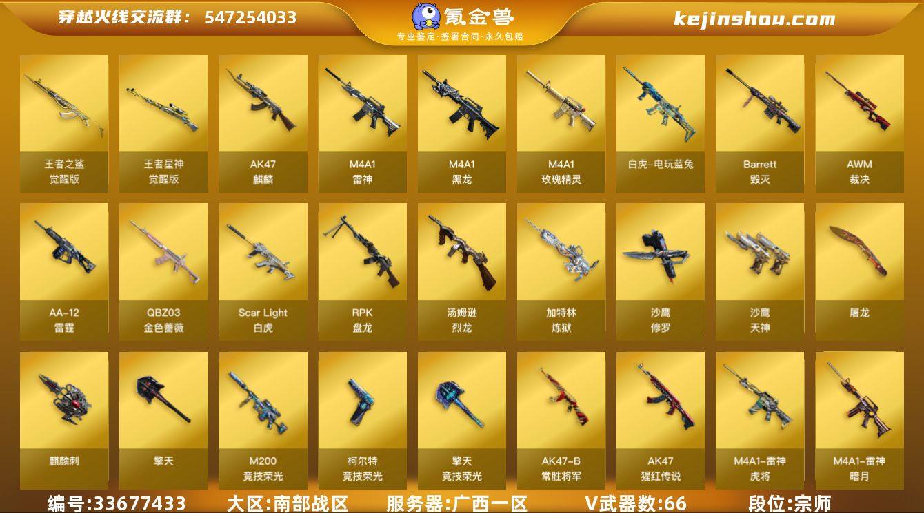 【ky6883】广西一区-70V-2王者武器数-0炫金武器数 【热门武器】:QBZ03-金色蔷薇,Scar Light-白虎,M200-竞技荣光,死亡之眼,白虎-电玩蓝兔,汤姆逊-烈龙*6,RPK-盘龙*6,加特林-炼狱*2,斯泰尔-蝴蝶,羊驼玩偶*3,沙鹰-修罗*2 【皮肤】:雷神-暗月,雷神-荣耀之魄,雷神-虎将,炼狱-玩具枪皮肤,火麒麟-平天大圣,毁灭-荣耀之怒,毁灭-黑大圣皮肤,毁灭-魔灵皮肤,毁灭-英雄计划 皮肤,战神-紫绶金章皮肤,AK47-B-常胜将军-曹操,屠龙-荣耀之锋 【角色】:电竞教官-云悠悠,乔伊教练,云海玲珑,斗烈龙骑,暗夜-X,初恋灵狐,芳心审判者,风暴女*2,娟娟,灵狐者-X,灵狐者-黄金海岸,灵狐者-七夕宝贝,龙儿,龙儿-小淘气,曼陀罗-礼服,潘多拉-X,潘多拉-甜心教官,青霞仙子,蛇姬,蜀雪,兔囡囡,雪莉杨-摸金校尉 【人偶武器】:斯泰尔-蝴蝶,海滩汪汪-巴雷特,迷你生化手雷,闪光弹-小乔,迷你艾比,迷你超能女侍 【暴走生化】:死亡之眼,超级对讲机 【英雄级武器】:AK47-麒麟,M4A1-黑龙,M4A1-雷神,Scar Light-白虎,QBZ03-金色蔷薇,M4A1-玫瑰精灵,AK-47-猩红传说,王者之鲨-觉醒版,AK47-B-常胜将军,白虎-电玩蓝兔,Barrett-毁灭,AWM-裁决,M200-竞技荣光,Ba...