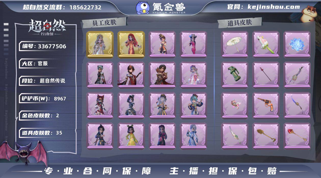 金皮2;紫皮17;道具皮35;皮肤:薇薇安-圣光之谕,巫铃儿-镜花辞,莉莉-除妖小师妹,巫铃儿-素影瑶光,艾伦-黎明猎手,小黄-异色序曲,莉莉-莓果陷阱,零-青云逸歌,爱丽丝-耀眼的你,小黄-呱呱雨衣,爱丽丝-甜梦派对,阿念-庆宴绮愿,逍遥-绣春逍影,零-搬开山,爱丽丝-丝缕哀歌,莉莉-情公主,薇薇安-仙锋小姐,阿念-迷途僵宝,薇薇安-白光莹;道具:传送按钮-逆时审判,葫芦-伏妖塔,专业手电-星寂,长鞭-缚誓之锁,音响-happy猫,除颤仪-冰晶般的代价,刺刀-紫气东来,闪光弹-金戈玄铜,音响-鸣沙鼓,额外的背包-飞花令,黄牛能量饮料-青玉抱丹,刺刀-美鲨匕首,夜视仪-金丝眼镜,黄牛能量饮料-珍珠芭乐莓莓,伞-郁金春信,喷气背包-乘风溯雪,急救包-蔷薇物语,腰包-宝剑八,电击枪-甜蜜泡泡枪,长鞭-小狗蛇点点鞭,传送按钮-昆仑镜,腰包-惊魂娃娃,铲子-圣心之泪,转轮手枪-新星时代,除颤仪-弦外之音,刺刀-碧络琅环,长枪-罪棘,铲子-龙鳞,腰包-月下莲台,长鞭-飞天绫,桃木剑-凤鸣九天,短管猎枪-赞萌露比水枪,摸金符-祝祷词,诱饵弹-诱饵弹,伞-伞;美妆:美妆-暗夜小恶魔;饰品:头饰-嘻嘻头套,头饰-青团糯糯,头饰-烈焰红唇头套,头饰-饺饺者头套,头饰-烛光纪念,头饰-卑微头套,头饰-火爆了头套,头饰-哈士奇头套,头饰-...