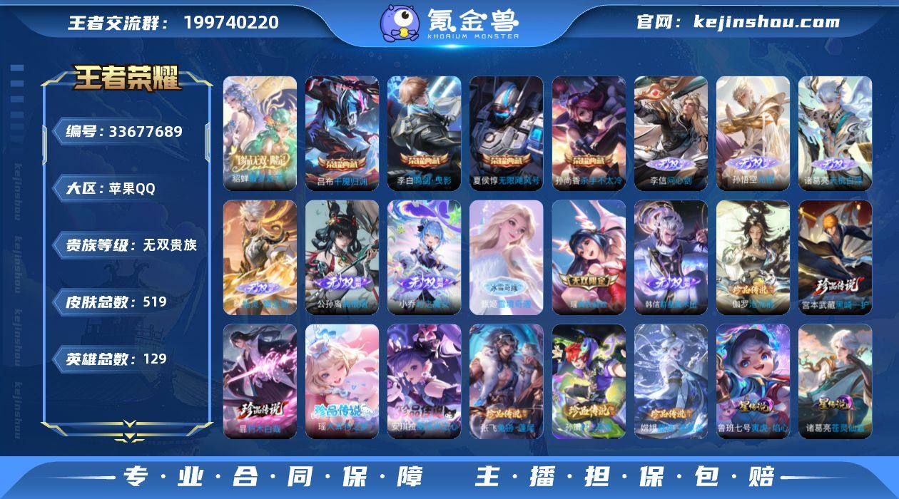 MCK634378 【无双贵族!墨染天幕!繁花貂蝉+9无双!14.5流光积分!】 皮肤数量519 【无双贵族】 【永恒钻石】 【不可修改】 账号类型7 天幕1 珍品无双1 无双9 荣耀典藏4 珍品8 星元皮肤3 传说108 史诗170 账号类型:女号,射手号,软辅号,中单号,上单号,全能号,打野号; 天幕:天幕-墨染江湖; 珍品无双:貂蝉_馥梦繁花; 无双:公孙离_离恨烟,李信_问心剑,孙悟空_无相,韩信_群星魔术团,诸葛亮_天机白泽,瑶_真我赫兹,甄姬_雪境奇遇,曜_器灵螭龙剑,小乔_时之魔女; 荣耀典藏:李白_鸣剑曳影,吕布_千魇归渊,夏侯惇_无限飓风号,孙尚香_杀手不太冷; 珍品:伽罗_沧流箭,暃_朽木白哉,宫本武藏_黑崎一护,瑶_大耳狗之梦,安琪拉_酷洛米之心,张飞_兔狲蓬尾,孙策_时之奇旅,嫦娥_器灵落星盏; 星元皮肤:诸葛亮_苍灵仙君,鲁班_寅虎·焰心,孙悟空_零号雷霆; 传说:阿轲_罗刹妄海,澜_逐花归海,韩信_踏浪归,项羽_无限倾心,海月_金乌负日,瑶_时之祈愿,大乔_挚爱花嫁,孙策_挚爱之约,王昭君_星穹之声,孙尚香_异界灵契,孙悟空_齐天大圣,东皇太一_灼幽烈阳,花木兰_异界灵契,云缨_神骥·越千峰,马超_神骥·逐星野,狄仁杰_神骥·赴朔漠,关羽_神骥·镇沧海,朵...