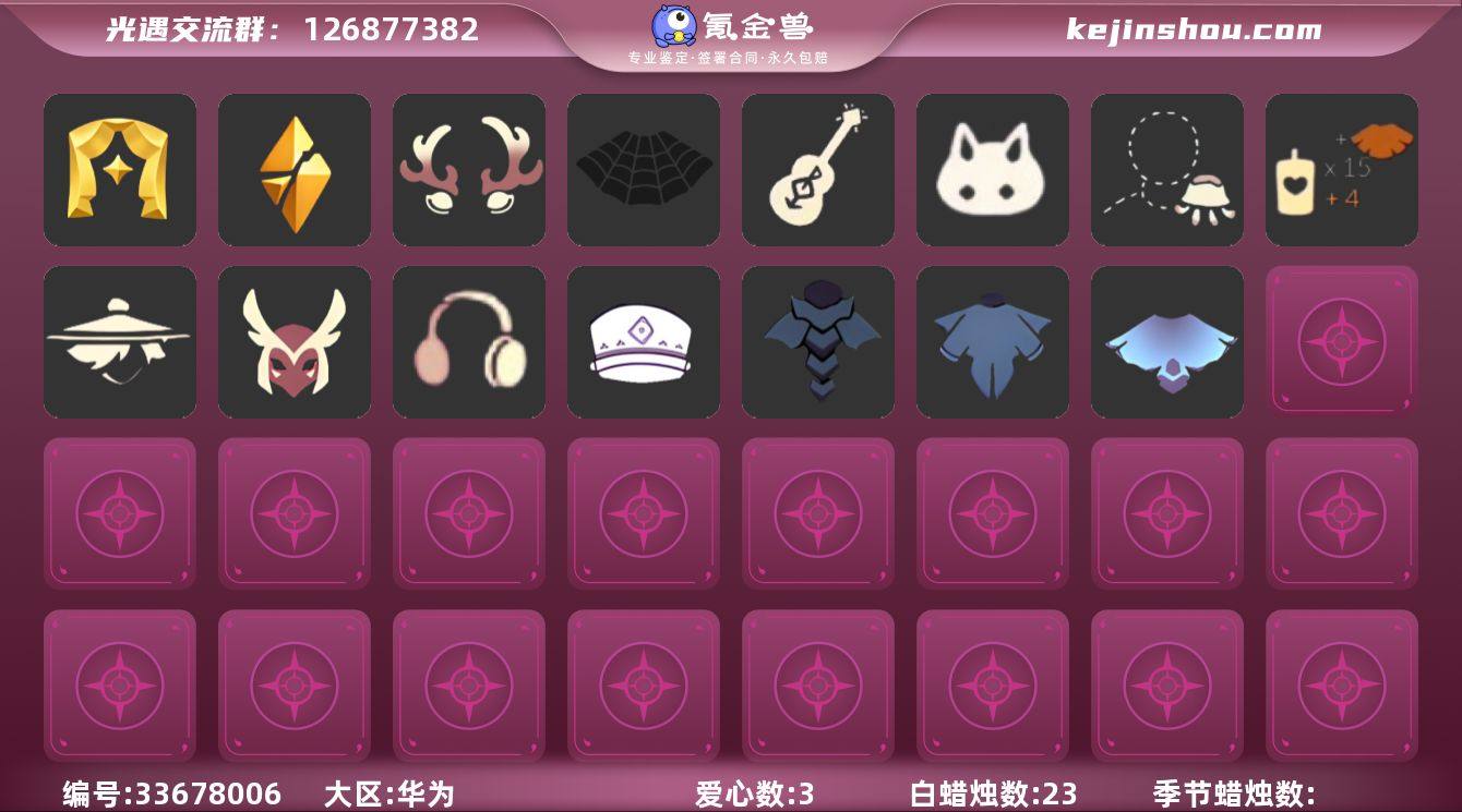 账号类型: 手机账号 季节已毕业: 表演季,破晓季 完成地图: 雨林,霞谷 珍稀物品: 白枭 礼包: 鹿角,蜘蛛斗,吉他,兔子,水母,创始人 面具: 黄眉企鹅面具 面饰: 红耳机 发型: 若笠 头饰: 平顶帽 斗篷: 遥鲲斗篷,燕尾斗篷,冥龙斗篷 亮点: 【优质装备】:表演季,白枭(帝企鹅发),破晓季,黄眉企鹅面具,遥鲲斗篷(双翼遥鲲斗),燕尾斗篷,冥龙斗篷,红耳机,鹿角(圣诞鹿角),蜘蛛斗(蛛丝斗篷)(蛛网斗篷),吉他(音韵吉他)(白吉他),雨林,霞谷,若笠(箬笠),创始人(创始人斗篷),兔子(玉兔头饰)(玉兔发饰)(兔子发饰),水母(水母肩饰)