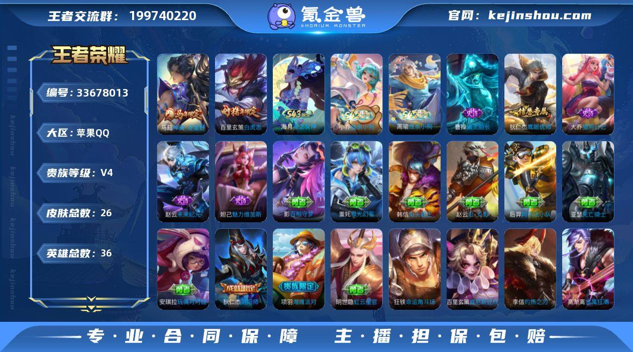 【捡漏小号推荐·白虎志·神骥逐星野·无二次包过】YXw23859-苹果Q-32英雄-26皮肤-1王者印记-20铭文-贵族积分0w【贵族4】【2传说·2按键】【因赛季更新游戏段付以上号为准!】 【传说皮肤】:马超神骥逐星野,百里玄策白虎志 【限定皮肤】:狄仁杰阴阳师,项羽海滩派对,百里玄策白虎志 【年限皮肤】:百里玄策白虎志 【战令限定】:周瑜线条小狗,小乔线条小狗 【史诗皮肤】:周瑜线条小狗,小乔线条小狗,狄仁杰鹰眼统帅,大乔猫狗日记,曹操幽灵船长,妲己魅力维加斯,赵云未来纪元 【其他皮肤】:影百相守梦,蚩奼极光幻客,明世隐虹云星官,狂铁命运角斗场,狄仁杰阴阳师,后羿阿尔法小队,亚瑟死亡骑士,安琪拉玩偶对对碰,赵云忍炎影,韩信街头霸王,项羽海滩派对,马超幸存者,李信灼热之刃,百里玄策威尼斯狂欢,铠龙域领主,高渐离金属狂潮