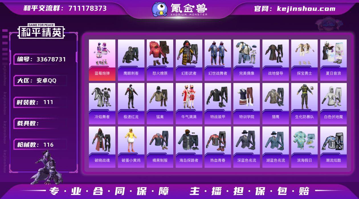 -1粉装-2特效枪-地铁天赋-32668热力值-7王牌印记-96套装-116枪皮【优质套装】: 蓝莓炮弹【稀有武器皮肤】: DBS-乌木金纹 SCAR-L-海盐豹豹 SLR-金丰海韵 蜜獾-乌木金纹 M416-红色方程式 M416-蓝色火焰 M416-夜灯 M416-糯团青竹 AKM-百万伏特 AKM-生命誓言 AKM-彩虹符号 AKM-破晓战魂 AKM-龙的传人 AKM-灼热熔岩 AKM-虎虎生威 AKM-霓虹街区 SCAR-L-红色方程式 SCAR-L-玉兔迎春 SCAR-L-暗夜玫瑰 M16A4-红色方程式 M16A4-蓝色火焰 GROZA-恐龙拽拽 GROZA-治愈之星 AUG-耀粉歌者 AUG-天降萌叽 QBZ-彩虹符号 M762-瑞龙福将 M762-天降萌叽 Mk47-乌木金纹 G36C-乌木金纹 AC-VAL-天降萌叽 蜜獾-天降萌叽 蜜獾-垂柳戏鸭 蜜獾-娇憨猪猪 Kar98K-乌木金纹 Kar98K-王子的夏天 Kar98K-红色方程式 Kar98K-幻影战神 Kar98K-彩虹符号 Kar98K-炫彩节奏 M24-乌木金纹 M24-炫彩节奏 AWM-天降萌叽 AWM-不夜海上花 Win94-瑞龙福将 莫辛纳甘-乌木金纹 M200-仲夏莫吉托 SKS-糯团青竹 Mini14-耀粉歌者 Mk14-乌木金纹 SLR-娇憨猪猪 UZI-炫彩节奏 UZI-红色方程式 UZI-娇憨猪猪 UZI-天降萌叽 UZI-啾咪啾咪 UMP45-蓝色火焰 UMP45-生命誓言 Vector-生命誓言 汤姆逊-耀粉歌者 汤姆逊-天降萌叽 汤姆逊-庄周梦蝶...