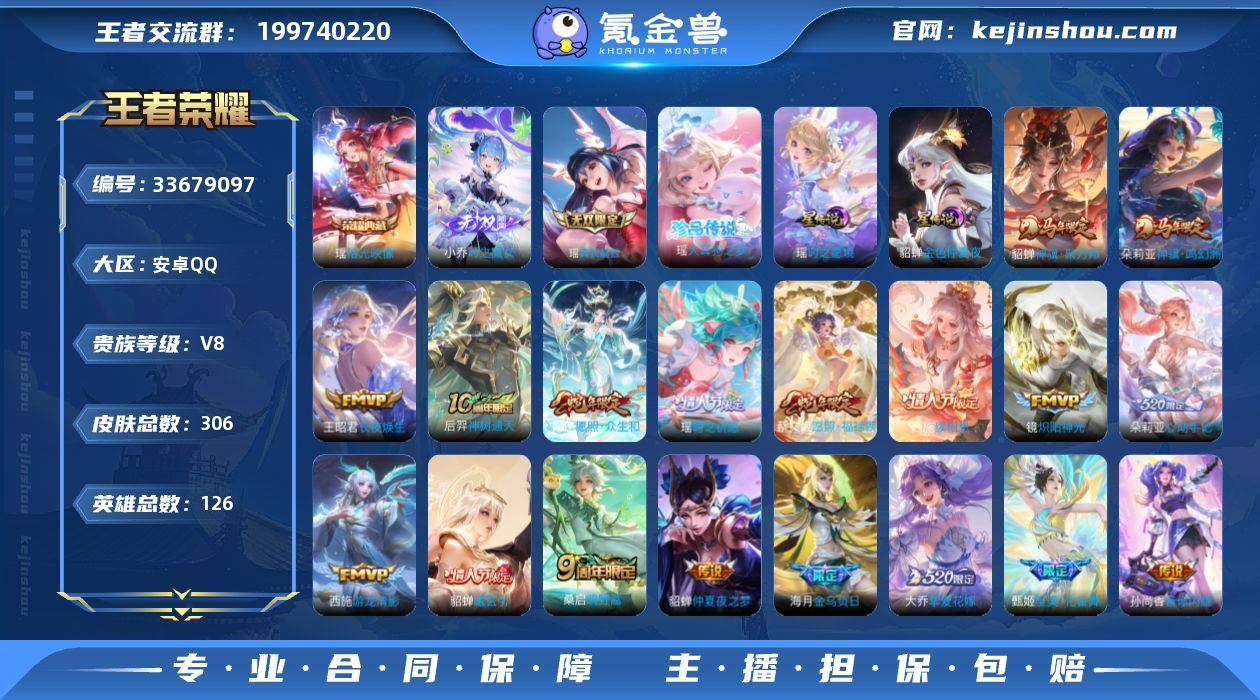0BHLE9不可二次v8"""306皮肤无双2水晶1珍品传说1极品女号传说20优质限定24 钱包已注销、信用分正常、无设备脸 水晶皮肤:拾光映像, 无双皮肤:时之魔女,真我赫兹(瑶), 珍品传说皮肤:大耳狗之梦, 新传说限定:神骥·聚万邦,神骥·鸣幻洲, 传说限定:愿照·众生和,至美·化雀舞,貂蝉曦玄引,金乌负日,续相思,朵莉亚心动手记,愿照·福禄聚,挚爱花嫁,时之祈愿-瑶,神树通天,启明星使, 新传说皮肤:长夜焕生, 传说皮肤:游龙清影,小动物乐团,炽阳神光,仲夏夜之梦,音你闪耀,鸣野蒿, 新史诗限定:织梦人,雪豹·霜爪,幻珠鲛人,百晓客, 史诗限定:时之彼端,乘龙·聚宝船,至美·乘鲤谣,琥珀纪元伽罗,白鹤梁神女,乘龙·忆丹青,山海·碧波行, 新史诗皮肤:浮梦罗烟,百相守梦-黄忠,奇遇星旅, 优质史诗皮肤:青蛇,唤灵魅影,时之奇旅-安琪拉,魅语,诗语江南,时之恋人-孙尚香,怒海争锋,真我赫兹(百里守约),白蛇,遇见神鹿, 周年皮肤:江河有灵,遇见飞天,鹤鸣心笺,神树通天,五谷丰年, 珍宝阁:万物之道,蔷薇恋人, 史诗皮肤:地狱岩魂,星夜王子,末日机甲-吕布,无心,乘风破浪,德古拉伯爵,水晶猎龙者,猫狗日记-孙策,未来纪元-赵云,节奏热浪,鬼剑武藏,千年之狐,紫霞仙子,暗隐猎兽者,冰冠公主,黎明之约,缤纷独角兽...