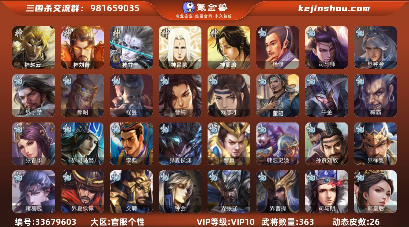 官阶:大将军;VIP等级:VIP10;史诗武将数量:34;动态皮肤数量:26;武将总数:363;史诗宝珠数量:1;将魂数量:8071;神将:3;魏国史诗武将:24;蜀国史诗武将:9;吴国史诗武将:5;群史诗武将:9 神赵云,神刘备,神甘宁,杨修,司马师,界钟会,界于禁,郝昭,曹纯,戏志才,程昱,马云騄,谋马超,诸葛瞻,周群,赵襄,张星彩,谯周,界黄忠,花鬘,骆统,留赞,界朱然,界徐盛,贺齐,左慈,苏飞,麹义,庞德公,祢衡,沮授,杜预,许攸,兀突骨,神吕蒙,神周瑜,SP关羽,SP曹仁,SP蔡文姬,乐进,曹昂,诸葛诞,朱灵,文聘,SP姜维,张春华,钟会,曹冲,郭淮,满宠,界王异,界曹操,界司马懿,界夏侯惇,界张辽,界许褚,界郭嘉,李典,曹真,韩浩史涣,陈群,曹叡,曹休,钟繇,司马朗,王基,李通,郭皇后,孙资刘放,辛宪英,界甄姬,吕虔,鲁芝,蒯越蒯良,界典韦,界荀彧,界徐晃,杜畿,界曹丕,界邓艾,张恭,界曹植,界曹彰,界满宠,界郭淮,卞夫人,界陈群,华歆,蔡贞姬,袁涣,谋徐晃,牛金,界夏侯渊,臧霸,唐咨,董昭,SP孙尚香,关银屏,夏侯霸,马良,关兴张苞,廖化,界马岱,关平,简雍,刘封,界法正,界关兴张苞,界刘备,界关羽,界张飞,界赵云,界马超,SP徐庶,吴懿,周仓,张松,刘谌,夏侯氏,糜竺,马忠,孙乾,李严,黄皓,吴苋,秦宓,界黄月英,界诸葛亮,赵统赵广,严颜,界伊籍,...
