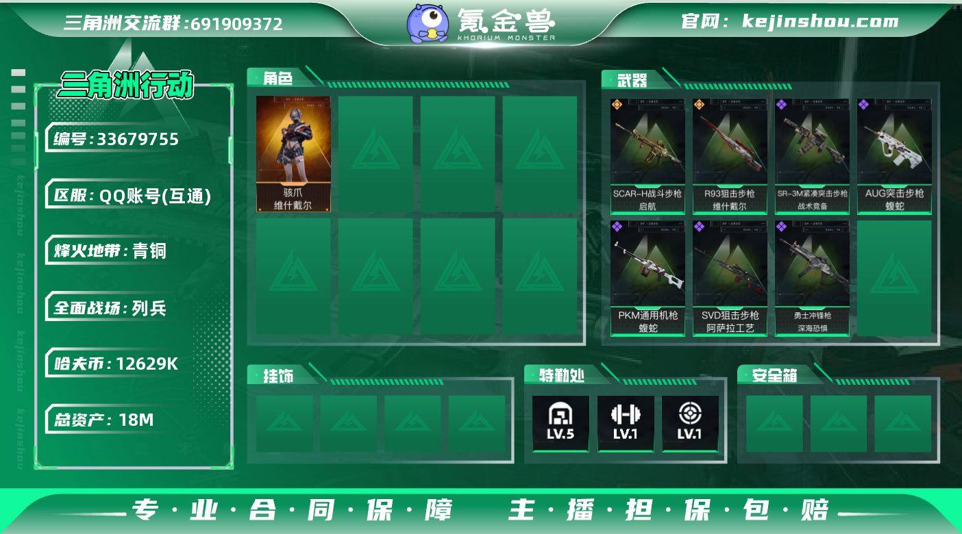 【959482】可二次 玩够能回血 1红维什戴尔 sjs11147 18m总资产-12629k哈夫币-20烽火等级-青铜-16战场等级-列兵 【干员外观】:骇爪-维什戴尔 【近战皮肤】:近战-黑鹰 【传说外观】:SCAR-H战斗步枪-启航,R93狙击步枪-维什戴尔 【史诗外观】:AUG突击步枪-蝮蛇,SR-3M紧凑突击步枪-战术竞备,勇士冲锋枪-深海恐惧,PKM通用机枪-蝮蛇,SVD狙击步枪-阿萨拉工艺 【稀有外观】:M4A1突击步枪-零点,ASh-12战斗步枪-星链科技,ASh-12战斗步枪-哈夫克航天,K416突击步枪-碳纤维,AK-12突击步枪-零点,SCAR-H战斗步枪-荣耀列队,Vector冲锋枪-先锋,勇士冲锋枪-冰天雪地,M1014霰弹枪-幻影结构,QJB201轻机枪-哈夫克卫队,SVD狙击步枪-战术行动,SR-25射手步枪-开拓,QSZ92G-一帆风顺 【普通外观】:M4A1突击步枪-粉色涂装,M4A1突击步枪-高雅黑,M4A1突击步枪-海色,QBZ95-1突击步枪-海浪,QBZ95-1突击步枪-海色,K416突击步枪-几何迷彩,K416突击步枪-高雅黑,AUG突击步枪-浅蓝涂装,M7战斗步枪-红色涂装,SG552突击步枪-海浪,SCAR-H战斗步枪-数码迷彩,G3战斗步枪-高雅黑,PTR-32突击步枪-黄蜂,MP5冲锋枪-海色,UZI冲锋枪-海色,UZI冲锋枪-狂欢,M1014霰弹枪-高雅黑,QJB201...