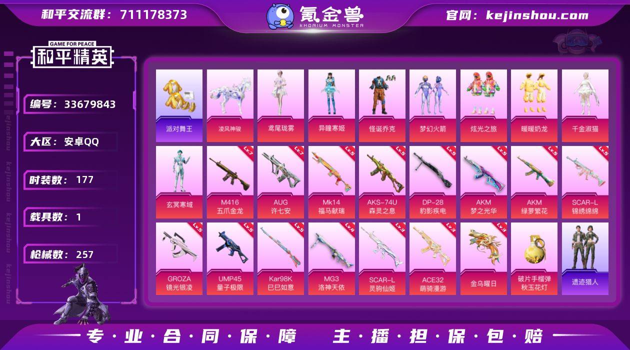 安卓 手Q-无敌战神框-8粉装-16特效枪-1载具-6粉色飞行器-81250热力值-19王牌印记-177套装-257枪皮 【热门品类】:粉装-怪诞乔克,粉装-梦幻火箭,套装-派对舞王,角色-军刀雅典娜,套装-AG战队服,套装-龟仙人,套装-暗影哥特,套装-红熊茄茄 【粉色套装】:粉装-怪诞乔克,粉装-梦幻火箭,粉装-炫光之旅,粉装-暖暖奶龙,角色-千金淑猫,角色-玄冥寒域,角色-异瞳寒姬,角色-鸢尾珑雾 【粉色枪皮等级】:AKM-梦之光华(五级),AKM-绿萝繁花(五级),SCAR-L-锦绣绵绵(五级),SCAR-L-灵驹仙姬(三级),M416-五爪金龙(七级),GROZA-镜光银凌(五级),AUG-许七安(七级),ACE32-萌骑漫游(三级),UMP45-量子极限(五级),AKS-74U-森灵之息(五级),Kar98K-巳巳如意(五级),Mk14-福马献瑞(五级),DP-28-豹影疾电(五级),MG3-洛神天依(四级),信号枪-金乌曜日(三级) 【粉色载具】:凌风神骏 【粉色枪皮】:AKM-梦之光华,AKM-绿萝繁花,SCAR-L-锦绣绵绵,SCAR-L-灵驹仙姬,M416-五爪金龙,GROZA-镜光银凌,AUG-许七安,ACE32-萌骑漫游,UMP45-量子极限,AKS-74U-森灵之息,Kar98K-巳巳如意,Mk14-福马献瑞,DP-28-豹影疾电,MG3-洛神天依,信号枪-金乌曜日,破片手榴弹-秋玉花灯 【粉色飞行...