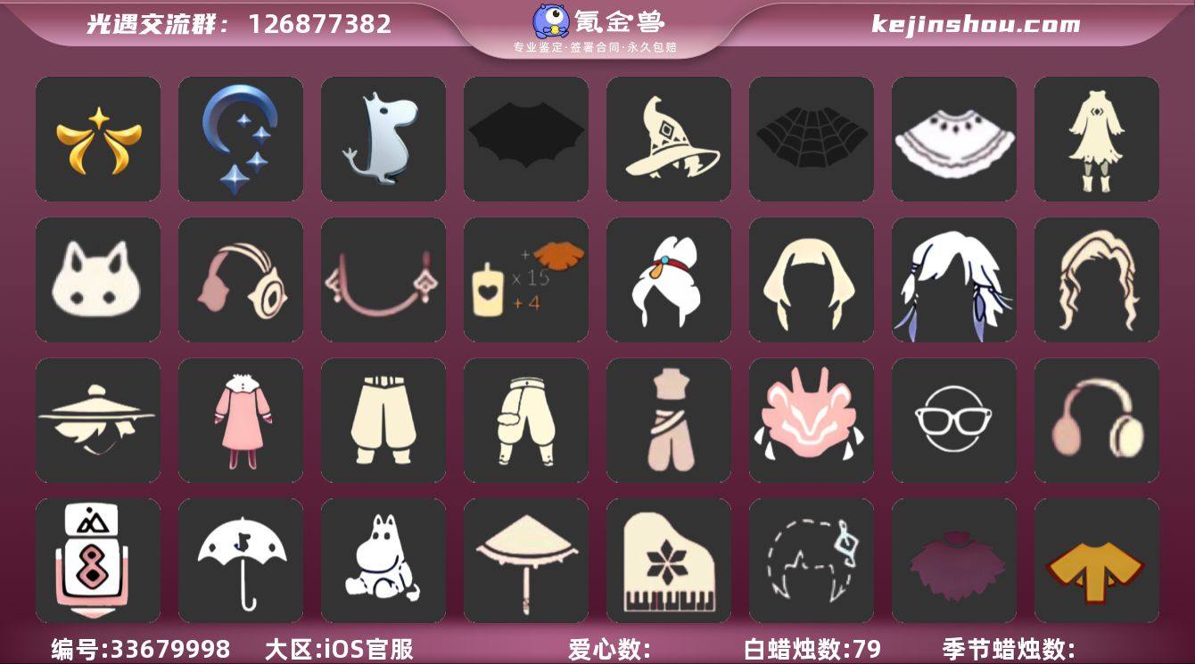 iOS官服 手机账号 1珍稀物品 3毕业季 3毕业图 79蜡烛 【珍稀物品】透明蝶翼斗 【季节已毕业】欧若拉季(欧若拉),夜行季,姆明季 【完成地图】晨岛,雨林,霞谷 【礼包】女巫裙,姆明饰品套装(姆明尾巴),巫师(巫师帽),兔子(玉兔头饰)(玉兔发饰)(兔子发饰),新年耳钉(金鳞耳饰),彩虹耳机,创始人(创始人斗篷),蝙蝠套(蝙蝠斗篷)(南瓜头),蜘蛛斗(蛛丝斗篷)(蛛网斗篷),白绒金(白雪斗篷) 【裤子】妮妮裙子(妮妮长裙),蓝绿裤(高领舞服),武士裤,搓澡巾 【面具】夜行毕业面具(棕熊面具) 【面饰】黑框眼镜(粗框眼镜),红耳机 【项链】围巾(肩带) 【发型】留辫蘑菇头,飞天盘发(九色鹿丸子头),虚荣,归巢毕业发型(五塑彩羽发),若笠(箬笠) 【头饰】蓝色音乐会(蓝色音乐符) 【斗篷】粉红绒毛斗篷(绒毛斗篷),黄色蓑衣(道袍) 【配饰】相机(季卡相机),小红伞(姆明红伞)(姆明大伞),姆明抱枕,雨伞,高音钢琴(白色高脚钢琴)