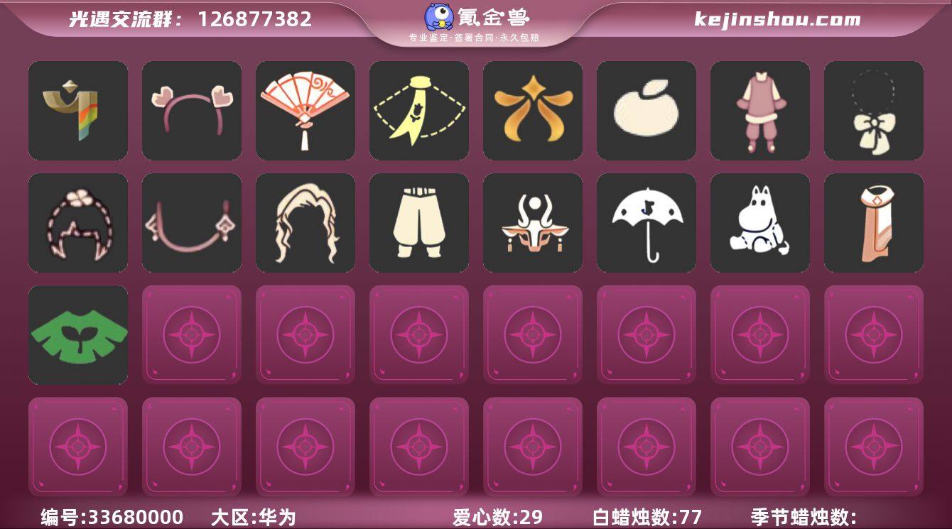 账号类型: 手机账号 季节已毕业: 彩染季 礼包: 围巾,欧若拉之翼,橘子,新年裤,蝴蝶结,四叶草,新年耳钉,献瑞折扇礼包,心心相印发饰礼包 裤子: 武士裤 面具: 辉光羚羊面具 发型: 虚荣 斗篷: 绿芽,彩染围巾斗篷 配饰: 姆明抱枕,小红伞 亮点: 【优质装备】:武士裤,姆明抱枕,小红伞(姆明红伞)(姆明大伞),辉光羚羊面具,彩染季,欧若拉之翼,围巾(小王子斗篷)(小王子围巾),新年裤(瑞气服饰),蝴蝶结(大蝴蝶结),献瑞折扇礼包,心心相印发饰礼包,新年耳钉(金鳞耳饰),橘子(大橘大利),四叶草(四叶草头饰)
