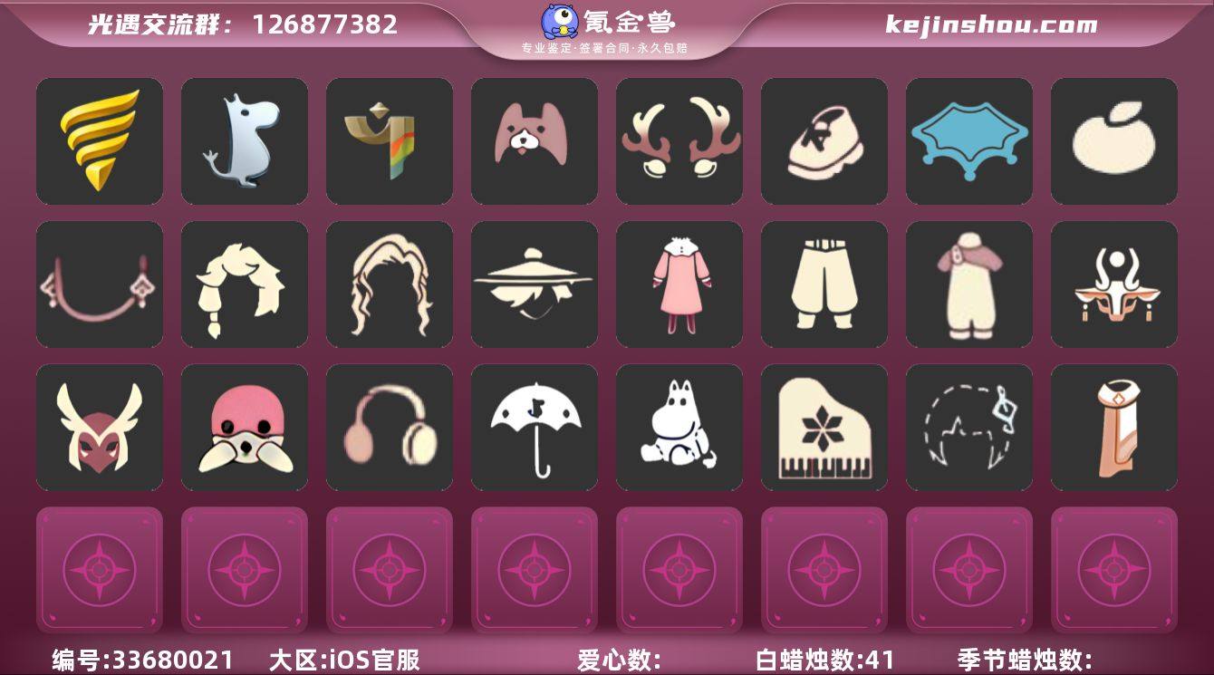 iOS官服 手机账号 3毕业季 2毕业图 41蜡烛 【季节已毕业】潜海季,姆明季,彩染季 【完成地图】雨林,霞谷 【礼包】运动鞋(跃动跑鞋),姆明饰品套装(姆明尾巴),橘子(大橘大利),小狗周年发饰(小狗周年头饰),新年耳钉(金鳞耳饰),鹿角(圣诞鹿角),线框斗篷礼包(周年线框斗篷),瑞雪(瑞雪斗篷)(暖冬瑞雪) 【裤子】妮妮裙子(妮妮长裙),武士裤,背带裤 【面具】黄眉企鹅面具,呼吸面具(潜水面具),辉光羚羊面具 【面饰】红耳机 【发型】单侧绑发(单边小辫),虚荣,若笠(箬笠) 【头饰】蓝色音乐会(蓝色音乐符) 【斗篷】彩染围巾斗篷,绿芽,海洋斗 【配饰】小红伞(姆明红伞)(姆明大伞),姆明抱枕,高音钢琴(白色高脚钢琴)