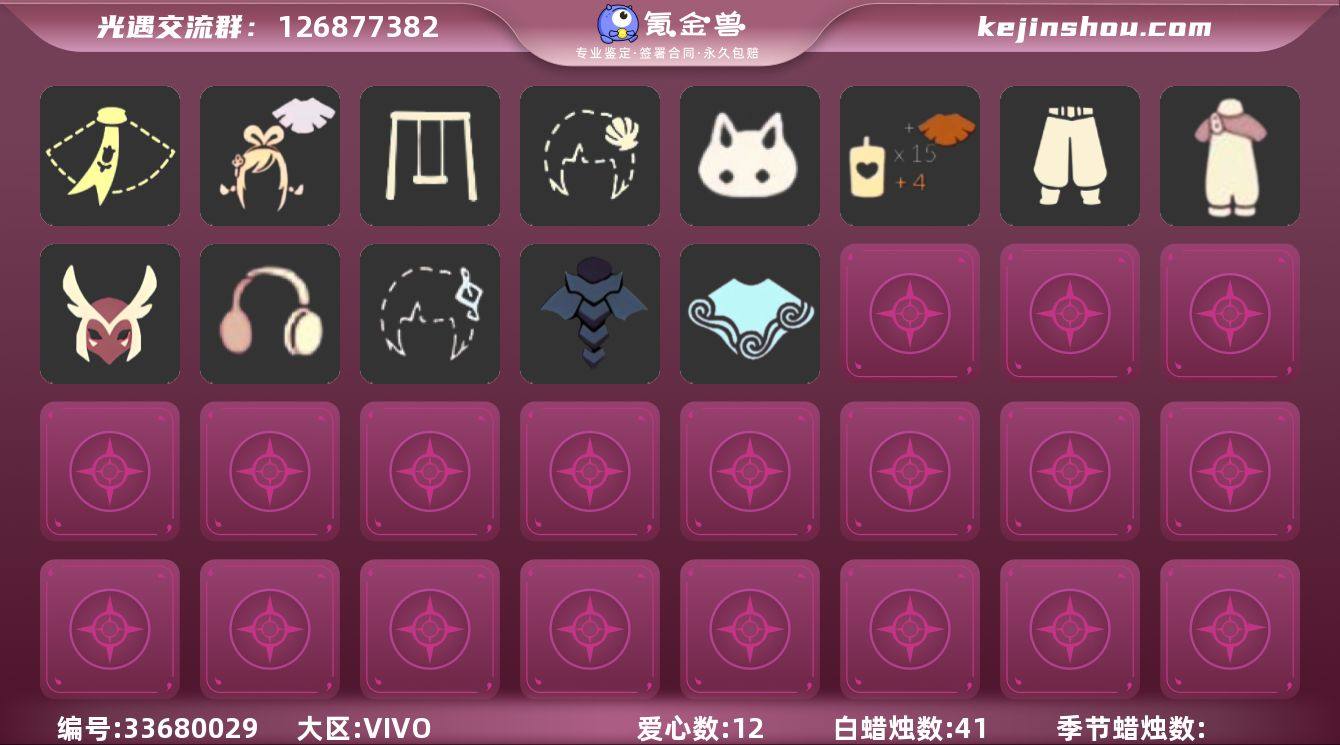 账号类型: 手机账号 完成地图: 晨岛,雨林,霞谷,暮土 珍稀物品: 白枭 礼包: 围巾,绊爱,秋千,贝壳,兔子,创始人 裤子: 武士裤,背带裤 面具: 黄眉企鹅面具 面饰: 红耳机 头饰: 蓝色音乐会 斗篷: 海洋斗,冥龙斗篷 亮点: 【优质装备】:白枭(帝企鹅发),武士裤,黄眉企鹅面具,冥龙斗篷,绊爱(绊爱斗篷)(绊爱礼包),秋千(情人秋千),红耳机,围巾(小王子斗篷)(小王子围巾),晨岛,雨林,霞谷,墓土(暮土),创始人(创始人斗篷),兔子(玉兔头饰)(玉兔发饰)(兔子发饰),贝壳(贝壳发饰)