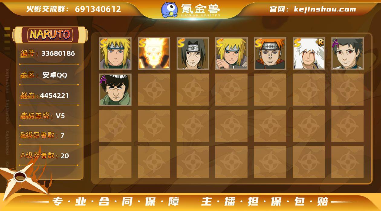 安卓qq-可二次-v5-接近500万战力-新手入坑首选账号-S忍者数:7- A忍者数:20 【S级忍者】漩涡鸣人「九喇嘛连结」(3星),波风水门「秽土转生」(3星),自来也「舞之豪杰」(3星),宇智波鼬「须佐能乎」(3星),漩涡鸣人·宇智波佐助(3星),佩恩「天道」(3星),波风水门(3星), 【A级忍者】漩涡鸣人「仙人模式」(2星),旗木卡卡西「忍界大战」(2星),黑土「四代目土影」(2星),千代「近松十人卫」(2星),我爱罗「忍界大战」(2星),不动(2星),蝎「绯流琥」(2星),宇智波泉奈(2星),宇智波止水(2星),干柿鬼鲛(2星),猿飞阿斯玛(2星),迈特凯(2星),蝎(2星),我爱罗「疾风传」(2星),飞段(2星),飞段「死司凭血」(2星),波风水门「青年」(2星),艾「青年」(2星),长门「青年」(2星),迈特凯「青春爆炸」(2星),