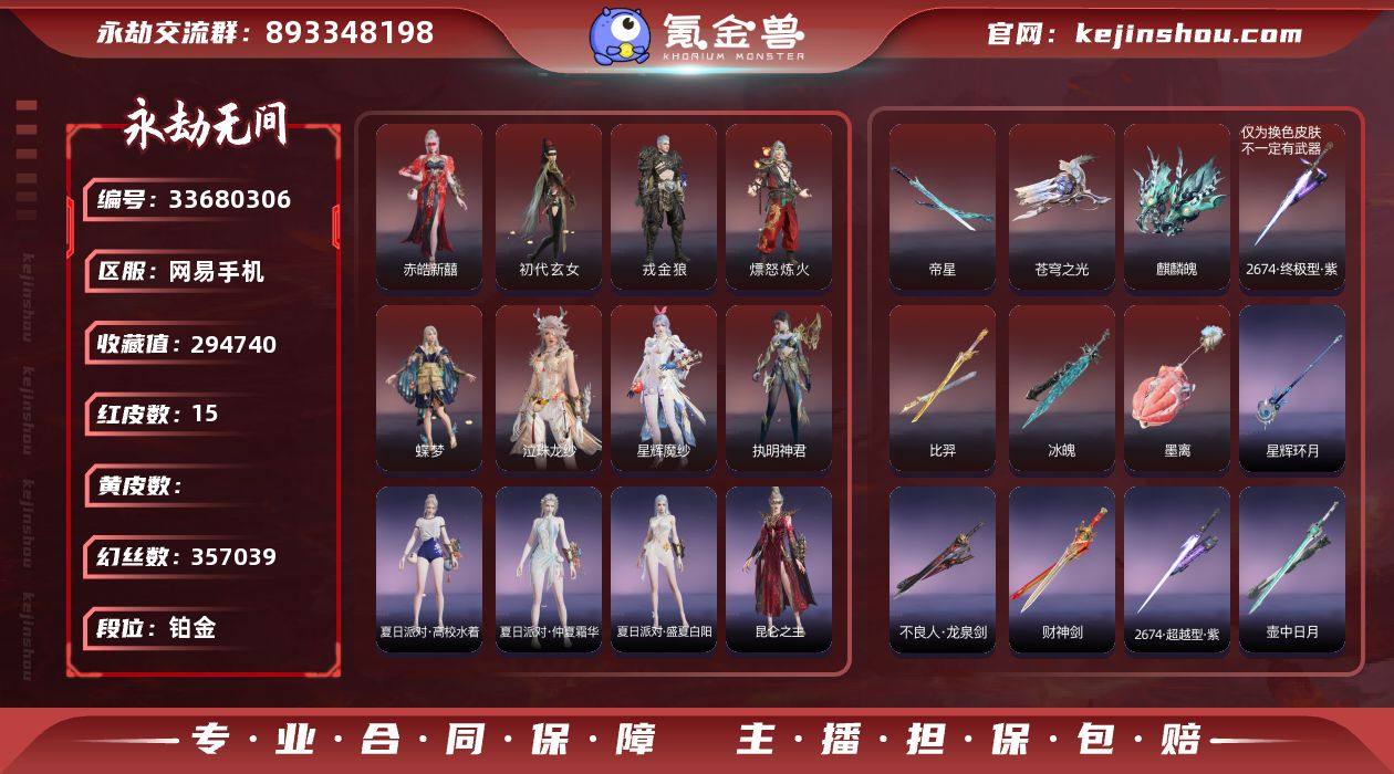 3泳装【红皮】:墨离(飞索皮肤),初代玄女(宁红叶皮肤),戎金狼(特木尔皮肤),熛怒炼火(季沧海皮肤),蝶梦(胡桃皮肤),冰魄(长剑皮肤),泣珠龙纱(崔三娘皮肤),赤皓新囍(宁红夜皮肤),比羿(横刀皮肤),执明神君(魏轻皮肤),2674·终极型·紫(长剑皮肤),麒麟魄(拳刃皮肤),星辉魔纱(沈妙皮肤),苍穹之光(五眼铳皮肤),帝星(横刀皮肤) 【外观总数】15红 506金 幻丝:357039金砖: 收藏值:29W 【换绑】:可换绑,期间登录网易大神不影响正常游戏,其他皮肤可参考以下截图,道具、段位以实际验号为准,段位因赛季原因发生变化,以上号为准"