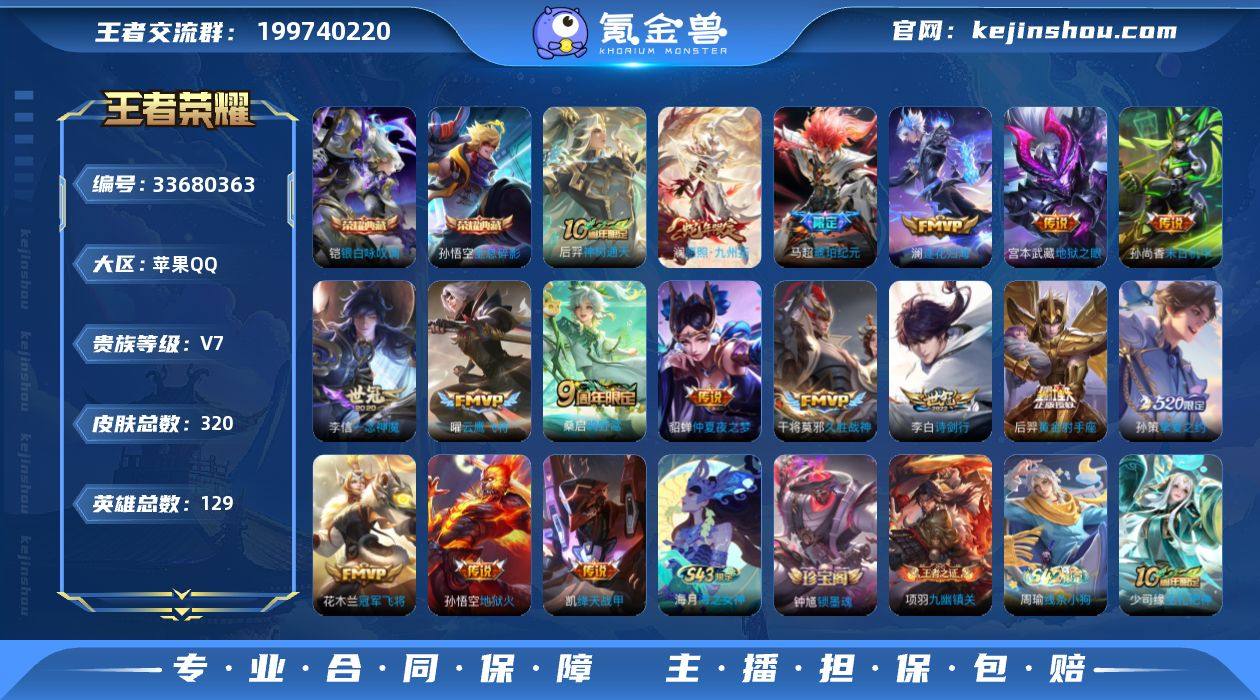 实名: 可修改 性别: 女号 贵族等级: V7 英雄数: 129 皮肤数: 320 荣耀水晶: 全息碎影,银白咏叹调 传说皮: 黄金射手座,冠军飞将,云鹰飞将,绛天战甲,久胜战神,一念神魔,末日机甲-孙尚香,地狱火,仲夏夜之梦,地狱之眼,挚爱之约,澜逐花归海,琥珀纪元马超,神树通天 限定皮: 李小龙,游园惊梦,御风骁将,引擎之心,朱雀志,高山流水,孙行者,傲雪梅枪,五谷丰年,诗剑行,鸣野蒿,逐霄战戟,愿照·九州拓 亮点: 【优质装备】:全息碎影(猴子典藏),银白咏叹调(倪克斯侍卫),黄金射手座,冠军飞将,云鹰飞将(小将军),绛天战甲(鸡嘴战神),久胜战神,一念神魔,末日机甲-孙尚香(绿蚂蚱),地狱火,仲夏夜之梦(大飞蛾),地狱之眼,挚爱之约,澜逐花归海,琥珀纪元马超,涂山容容