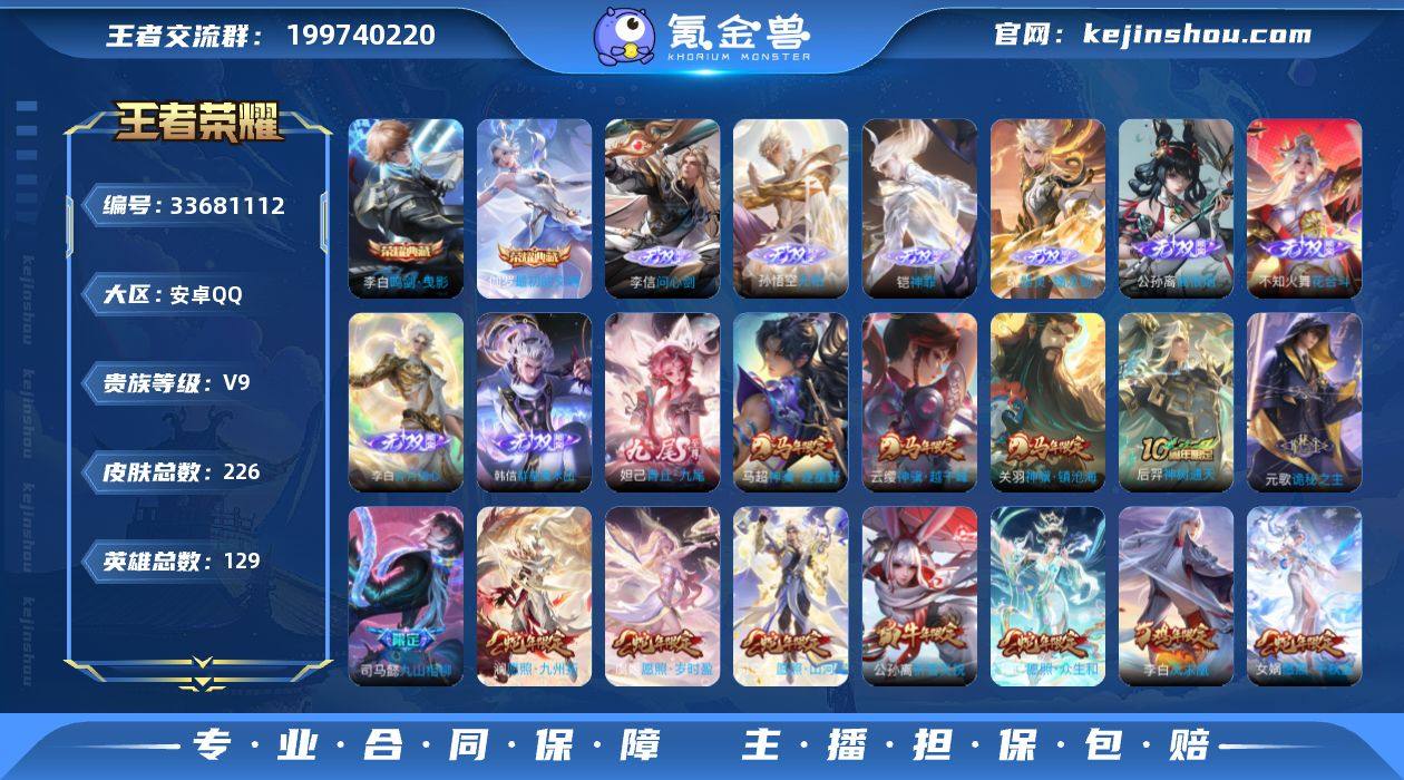 实名: 可修改 性别: 男号 贵族等级: V9 英雄数: 129 皮肤数: 226 荣耀水晶: 鸣剑·曳影,最初的交响 无双皮: 青丘·九尾,碎月剑心,韩信群星魔术团,花合斗,离恨烟,器灵·螭龙剑,神罪,无相,问心剑 传说皮: 炽阳神光,地狱火,仲夏夜之梦,地狱之眼,乞巧织情,时之恋人-刘备,无双飞将,碎云,神器·狴犴令,山海·苍雷引,青丘·九尾,鹤羽星尊,妄想实况,遇见神鼓,霜月吟,澜逐花归海,琥珀纪元马超,乘龙·问璇玑,乘龙·铭钟鼎,乘龙·淬吴钩,金乌负日,黄金天蝎座,幻光神枪,祥瑞亨通,九山相柳,诡秘之主,神树通天,神骥·越千峰,神骥·逐星野,神骥·镇沧海 限定皮: 遇见飞天,祈雪灵祝,梁祝,武圣,岱宗,神威,凤求凰,至尊宝,大圣娶亲,匿光追影者,寅虎·赤拳,玉兔公主,深海之息,五谷丰年,绯月行,神器·万象笔,山海·玄木吟,影龙天霄,鸣野蒿,愿照·千秋盛,愿照·众生和,愿照·山河定,愿照·岁时盈,愿照·福禄聚,愿照·九州拓 亮点: 【优质装备】:鸣剑·曳影,青丘·九尾(妲己无双),碎月剑心(李白无双),韩信群星魔术团(韩信无双),花合斗,离恨烟(公孙离无双),器灵·螭龙剑,最初的交响(伽罗典藏),炽阳神光,地狱火,仲夏夜之梦(大飞蛾),地狱之眼,乞巧织情,时之恋人-刘备(电焊工),无双飞将,碎云,神器·狴犴令,山海·苍雷引(电光曜子),青...
