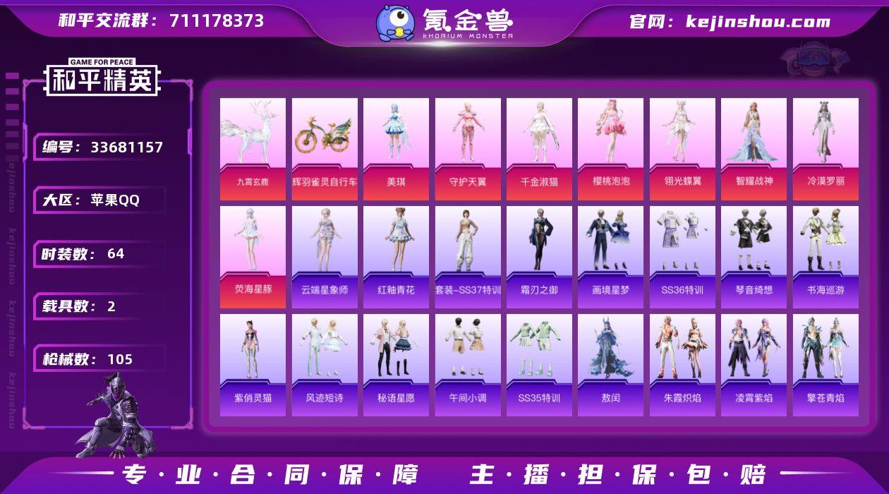 【和平精英】10粉装,16特效枪,2载具,历史最高段位:卓越王牌14星 王牌印记7次 热力值:65336,96套装,176枪械,274装备,109战备;套装:精灵之光-露米娜,辉羽雀灵-初翊,魔童闹海-哪吒,角色-美琪,角色-守护天翼,角色-千金淑猫,角色-樱桃泡泡,角色-智耀战神,角色-翎光蝶翼,角色-冷漠罗丽,角色-荧海星豚,角色-奇迹舞步 美琪,人物-小舞·雪昙,套装-街头潮人,套装-魅力单车,套装-幻世战舞者,套装-青涩时光,套装-阳光火鸡,套装-狙击之神,套装-迅捷龙虾,套装-红熊茄茄,套装-懵萌河马,套装-王牌教练,套装-柠萌假日,套装-青玉碎影,套装-香桃花海,套装-漫游都市,套装-恋语绒绒,角色-湖雨初晴,套装-铁血战翼,套装- 暗影刺翼,套装-晨曦轻云,角色-紫俏灵猫,角色-无面战甲,套装-异域银装,角色-蜜桃派对,角色-都市丽猫,角色-糖霜甜心,套装-绒绒粉兔,套装-小鸟芋圆,套装-SS31特训,套装-鱼渊荷华,套装-燕燕于飞,角色-瑰梦爱神,套装-紫幽梦,套装-粉恋花,套装-SS33特训,角色-猎影月神,套装-云朵鹅,角色-冷霜之星,套装-SS32特训,套装-彩虹兔,角色-冰晶湖光,套装-青翼流星,套装-蓝冰羽,套装-顶瓜瓜,套装-雪绒豹,套装-狂鲨锋刃,套装-大...