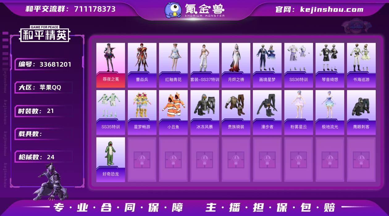 【和平精英】1粉装,3特效枪,0载具,历史最高段位:绝世王牌21星 王牌印记3次 热力值:17802,45套装,60枪械,90装备,35战备;套装:角色-罪夜之冕,套装-黄色运动,套装-黑色伏地魔,套装-竞技名士,套装-漫步者,套装-海岛探路者,套装-灼焰舞者,套装-贵族骑装,套装-鹰眼刺客,套装-冰冻风暴,套装-街头潮人,套装-绮丽涂鸦,套装-青涩时光,套装-小丑鱼,套装-阳光火鸡,套装-好奇恐龙,套装-白糯汤圆,套装-狙击之神,套装-星梦畅游,套装-柠萌假日,套装-香桃花海,套装-云魄琉璃,角色-极地流光,角色-粉雾星云,套装-街头风暴,套装-青翼流星,套装-狂鲨锋刃,套装-炫彩糖果,套装-元气之梦,套装-SS34特训,套装-SS35特训,套装-琴音绮想,角色-超感刻度,套装-画境星梦,套装-书海巡游,角色-月烬之祷,套装-SS37特训,套装-SS36特训,套装-红釉青花,套装-雪国风尚,套装-雨过天青,套装-萌鸡速递,角色-曹焱兵,套装-福马献瑞,套装-马上有钱;枪皮:SCAR-L-夜灯,AKM-影袭,AKM-霓彩脉冲,GROZA-紫矿核心,GROZA-福马献瑞,3级AUG-星梦奇缘,AUG-甜蜜菠萝,AUG-绝对恒星,AUG-冰晶雪宝,M416-蓝色火焰,ACE32-画境星梦,ACE32-冰晶雪宝,蜜獾-启元战纹,M762-...