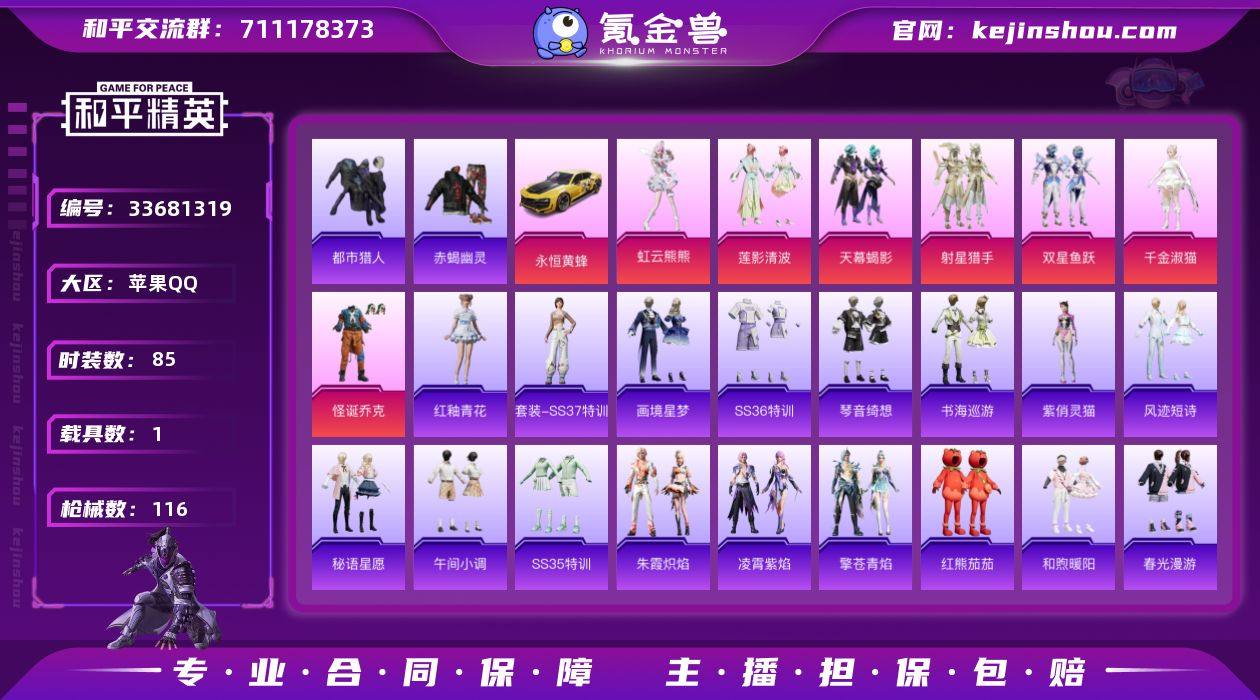 【和平精英】7粉装,8特效枪,1载具,历史最高段位:无敌战神 王牌印记16次 热力值:75601,150套装,240枪械,301装备,132战备;套装:套装-怪诞乔克,套装-天幕蝎影,套装-双星鱼跃,套装-射星猎手,套装-莲影清波,角色-千金淑猫,角色-虹云熊熊,套装-蓝色运动,套装-竞技名士,套装-猛禽,套装-长空猛禽,套装-漫步者,套装-海岛探路者,套装-赤蝎幽灵,套装-冷焰舞者,套装-都市猎人,套装-燃烧卡路里,套装-鹰眼刺客,套装-冰冻风暴,套装-完美偶像,套装-街头潮人,套装-蓝彩潮人,套装-魅力单车,套装-绮丽涂鸦,套装-坚韧舞者,套装-热血青春,套装-幻世战舞者,套装-清新柠檬,套装-血色贵族,套装-暗影哥特,套装-弄潮海豚,套装-夏日倾情,套装-青涩时光,套装-缤纷果语,套装-滨海厨神,套装-龙魂突击队,套装-麻辣教官,套装-霓虹街区,套装-牛气满满,套装-战术大师,套装-狙击之神,套装-飞行日记,套装-曼妙人鱼,套装-热情海星,套装-纯真浪花,套装-SS20特训,套装-SS21特训,套装-红熊茄茄,套装-玉兔迎春,套装-SS22特训,套装-和煦暖阳,套装-田园牧歌,套装-轻风白浪,套装-绚烂繁星,套装-绯格组合,套装-SS23特训,套装-香榭午后,套装-甜梦熊熊,套...