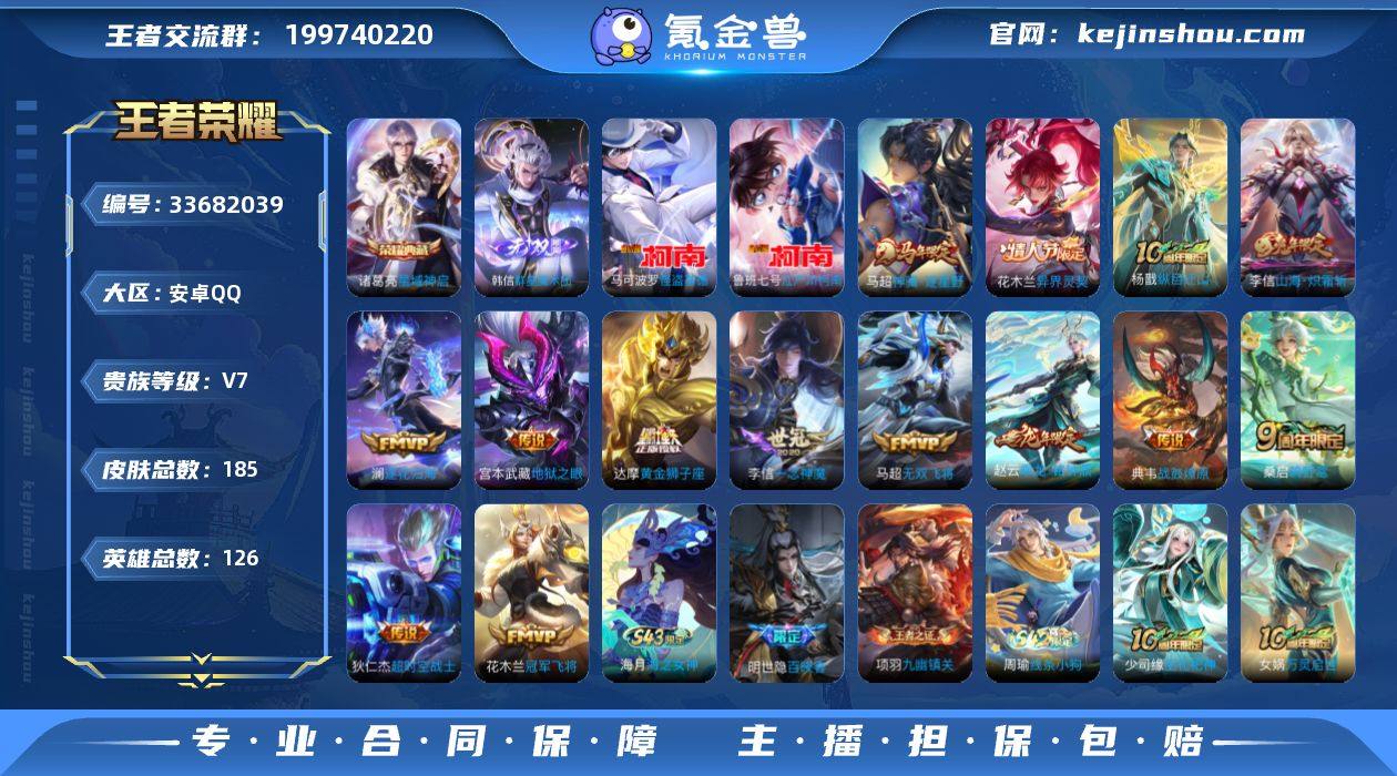 实名: 可修改 性别: 男号 贵族等级: V7 英雄数: 126 皮肤数: 185 荣耀水晶: 星域神启 无双皮: 韩信群星魔术团 珍品传说: 江户川柯南,怪盗基德 传说皮: 黄金狮子座,冠军飞将,一念神魔,地狱之眼,超时空战士-狄仁杰,无双飞将,山海·炽霜斩,澜逐花归海,乘龙·铭钟鼎,典韦战鼓燎原,纵目迁山,神骥·逐星野,异界灵契-花木兰 限定皮: 青龙志,至尊宝,大圣娶亲,傲雪梅枪,降魔,鸣野蒿,逐霄战戟 亮点: 【优质装备】:星域神启(倪克斯贼亮),韩信群星魔术团(韩信无双),江户川柯南,怪盗基德,黄金狮子座,冠军飞将,一念神魔,地狱之眼,超时空战士-狄仁杰,无双飞将,山海·炽霜斩(李信年限),澜逐花归海,涂山容容