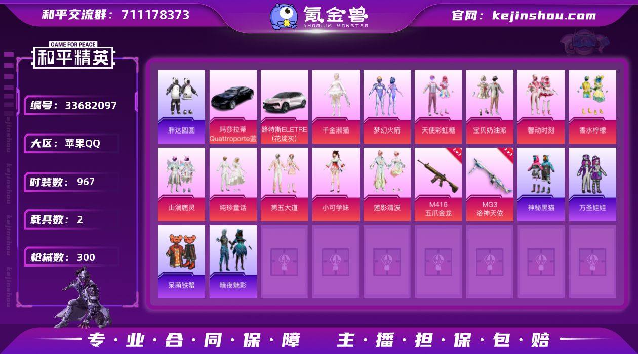 15粉装 7特效枪 2载具 16印记 可二次 可修改实名 【热门装扮】千金淑猫,荧海星豚,羊梦糖心,霁蓝缠春,梦幻火箭(新101) ,天使彩虹糖,宝贝奶油派,馨动时刻,香水柠檬,山涧鹿灵,纯珍童话,第五大道,呆萌星弥,小可学妹,莲影清波,神秘黑猫,胖达圆圆,万圣娃娃,呆萌铁蟹,暗夜魅影 【载具】玛莎拉蒂Quattroporte(夜幕蓝),路特斯ELETRE(花绽灰),僚机-萌兔起飞 【稀有枪皮】AMR-智耀战神,Kar98K-巳巳如意,ACE32-萌骑漫游,14-福马献瑞,DP-28-豹影疾电,M416五爪金龙,MG3洛神天依 【七级特效枪】七级AMR-智耀战神,七级M416-五爪金龙,七级MG3-洛神天依 【五级特效枪】五级Kar98K-巳巳如意,五级DP-28-豹影疾电,五级14-福马献瑞 【四级特效枪】四级ACE32-萌骑漫游 【紫色装扮】幽雨猫猫,马上来财,朱霞炽焰,凌霄紫焰,擎苍青焰,SS34特训套装,游乐,沙漠毒蛇,极地朋克,橘黑制服,格斗先锋,柠萌假日,朋克治安官,沙漠兵团,吉莉礼服,坚韧舞者,圣诞大吉,和平特警,夜莺强袭者,千禧之恋,北国孤狼,刚毅裁决者,夏日音浪,探宝勇士,战地菁英,完美偶像,幻世战舞者,帅气教官,湖蓝色名流,海岛探路者,破蛋小黄鸡,猛禽,王牌教练,甜蜜告白,甜蜜熊情侣,甜蜜菠萝,疯狂小兔子,白熊同盟,白色伏地魔,神秘领域,福星高照,空岛...