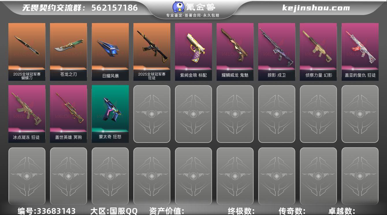 S194639 【2025全球冠军赛套装】无畏契约/64级/未定级/22英雄/27皮肤/资产19170/已使用R点410/剩余R点130/2025全球冠军赛-狂徒,2025全球冠军赛-蝴蝶刀,盖亚的复仇-狂徒,侦察力量-幻影,冰点凝冻-狂徒,掠影-戍卫,日耀风暴-遗器,5周年//公测重制版-苍龙之刃,盖世英雄-冥驹,掠影//3.0-追猎,紫阙金琅-标配,耀鳞威龙-鬼魅