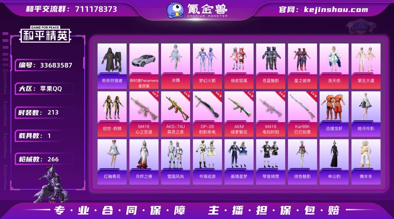 苹果 手Q-8粉装-6特效枪-1载具-5粉色飞行器-86971热力值-10王牌印记-213套装-266枪皮 【热门品类】:粉装-梦幻火箭,套装-奇异狩猎者,套装-龟仙人,套装-粉红小猪 【粉色套装】:粉装-梦幻火箭,粉装-俏皮狐尾,粉装-苍蓝魅影,粉装-星之彼岸,角色-洛天依,粉装-第五大道,套装-创世·救赎,角色-冰魄 【粉色枪皮等级】:AKM-绿萝繁花(五级),M416-心之恋语(七级),M416-电玩时刻(五级),AKS-74U-森灵之息(五级),Kar98K-巳巳如意(五级),DP-28-豹影疾电(五级) 【粉色载具】:保时捷Panamera(星辰紫) 【粉色枪皮】:AKM-绿萝繁花,M416-心之恋语,M416-电玩时刻,AKS-74U-森灵之息,Kar98K-巳巳如意,DP-28-豹影疾电 【粉色飞行器】:炫彩糖果飞行器,天之羽翼飞行器,星夜魔法师飞行翼,千面幻镜飞行器 【粉色降落伞】:至尊龙雀降落伞,春暖花开降落伞,炫紫旋律降落伞,神秘黑猫降落伞,心之恋语降落伞,荧光虫舞降落伞,银刃赛罗降落伞,童趣迷兔降落伞,香水柠檬降落伞,星之彼岸降落伞,怪笑疯兔降落伞,齐天大圣降落伞,垂柳戏鸭降落伞,彩虹甜喵降落伞,仲夏莫吉托降落伞,超新星降落伞,精灵梦叶罗丽降落伞,创世·救赎降落伞,未来领航者降落伞,脆鲨七海降落伞,...