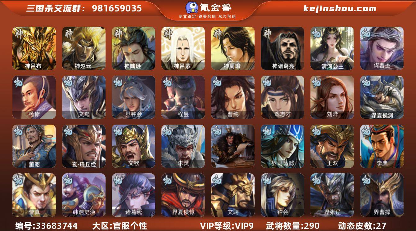 VIP等级: VIP9 官阶: 骠骑将军 武将数量: 290 动态皮肤数量: 27 神将: 神陆逊,神吕布,神赵云,神吕蒙,神周瑜,神诸葛亮 魏国武将: 刘晔,戏志才,曹纯,程昱,界钟会,文鸯,杨修,唐咨-魏,张辽,SP蔡文姬,SP曹仁,SP关羽,SP贾诩,SP姜维,蔡贞姬,曹昂,曹操,曹冲,曹丕,曹仁,曹叡,王异,张恭,鲁芝,曹休,界曹植,满宠,荀攸,钟繇,郭嘉,牵招,荀彧,杜畿,界郭嘉,崔琰,界曹丕,朱灵,界甄姬,辛毗,界王异,陈群,界曹休,袁涣,乐进,辛宪英,郭淮,毛玠,郭皇后,夏侯惇,曹植,司马朗,界曹操,许褚,界张辽,谋徐晃,张郃,钟会,文聘,曹彰,界夏侯惇,诸葛诞,司马懿,甄姬,徐晃,韩浩史涣,曹真,谋曹丕,典韦,夏侯渊,李典,于禁,王双,邓艾,界司马懿,孟达-魏,朱灵(国战),文钦-魏,玄·毌丘俭,清河公主,董昭,谋夏侯渊 蜀国武将: 花鬘,谯周,沙摩柯,谋赵云,徐庶,界关羽,界诸葛亮,邓芝,界伊籍,严颜,界张嶷,赵云,张松,彭羕,界刘备,刘封,糜竺,谋庞统,黄月英,关羽,吴懿,祝融,张飞,陈震,魏延,界周仓,界法正,糜夫人,刘禅,界赵云,张翼,关银屏,SP孙尚香,SP徐庶,卧龙诸葛,周仓,简雍,界关兴张苞,诸葛亮,界张飞,法正,界简雍,界马岱,关平,马岱,界庞统,庞统,诸葛果,谋张飞,马谡,马超,霍峻,廖化,关兴张苞,孟获,夏侯氏,姜维,黄忠,刘备,界马超,李严,...