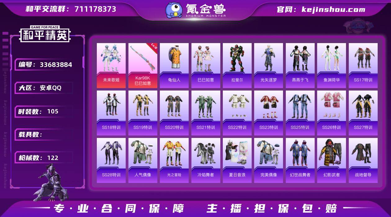 安卓 手Q-1粉装-1特效枪-0载具-2粉色飞行器-37617热力值-7王牌印记-105套装-122枪皮 【热门品类】:套装-龟仙人 【粉色套装】:粉装-未来歌姬 【粉色枪皮等级】:Kar98K-巳巳如意(五级) 【粉色枪皮】:Kar98K-巳巳如意 【粉色飞行器】:齐天大圣飞行器,沙丘之主天马 【粉色降落伞】:深海曼妙降落伞,四圣焕新降落伞,星之彼岸降落伞,洛神天依降落伞,垂柳戏鸭降落伞,冠军兔兔降落伞,创世·救赎降落伞,金丰海韵降落伞,拳皇·狂花道降落伞,千金淑猫降落伞,临安公主降落伞,月影灵韵降落伞,鬼刀降落伞,雪月幻音降落伞 【稀有套装】:套装-龟仙人,套装-巳巳如意,角色-拉斐尔,角色-光矢逐梦,套装-燕燕于飞,套装-鱼渊荷华 【稀有枪皮】:AKM-破晓战魂,AKM-萌趣颜团子,M16A4-幻世战舞者,M16A4-红色方程式,SCAR-L-炫彩节奏,SCAR-L-玉兔迎春,SCAR-L-红色方程式,M416-糯团青竹,M416-蓝色火焰,GROZA-田园牧歌,AUG-耀粉歌者,QBZ-彩虹符号,QBZ-飞驰魅影,M762-天降萌叽,M762-奇异狩猎者,M762-瑞龙福将,Mk47-洛神天依,AC-VAL-天降萌叽,蜜獾-天降萌叽,蜜獾-娇憨猪猪,UZI-天降萌叽,UZI-娇憨猪猪,UZI-炫彩节奏,UMP45-夜灯,UMP45-生命誓言,UMP45-蓝色火焰...