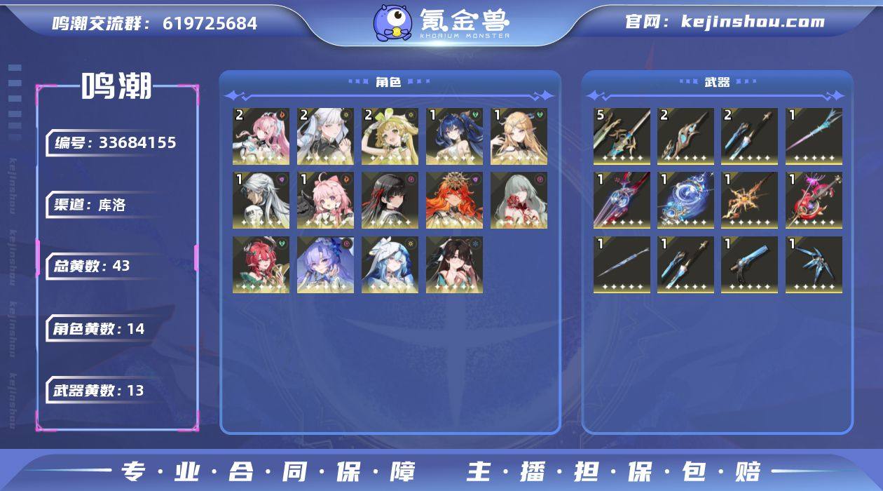 男/女主: 女主 总黄数: 43 联觉等级: 80 拥有五星共鸣者: 卡卡罗,安可,维里奈,今汐,折枝,守岸人,坎特蕾拉,夏空,卡提希娅,弗洛洛,奥古斯塔,尤诺,千咲,爱弥斯 2鸣五星共鸣者: 2鸣维里奈,2鸣今汐,2鸣爱弥斯 1鸣五星共鸣者: 1鸣卡卡罗,1鸣安可,1鸣卡提希娅,1鸣尤诺 0鸣五星共鸣者: 0鸣折枝,0鸣守岸人,0鸣坎特蕾拉,0鸣夏空,0鸣弗洛洛,0鸣奥古斯塔,0鸣千咲 拥有五星武器: 千古洑流,停驻之烟,漪澜浮录,时和岁稔,血誓盟约,不屈命定之冠,幽冥的忘忧章,驭冕铸雷之权,万物持存的注释,昙切,永远的启明星 5鸣五星武器: 5鸣血誓盟约 2鸣五星武器: 2鸣千古洑流,2鸣时和岁稔 1鸣五星武器: 1鸣千古洑流,1鸣停驻之烟,1鸣漪澜浮录,1鸣不屈命定之冠,1鸣幽冥的忘忧章,1鸣驭冕铸雷之权,1鸣万物持存的注释,1鸣昙切,1鸣永远的启明星 亮点: 【MC344】80级/43黄/女主/14个五星角色/13个五星武器未绑定,爱弥斯,夏空,卡提希娅,弗洛洛,奥古斯塔,尤诺,千咲,坎特蕾拉,今汐,守岸人,折枝,维里奈,卡卡罗,安可,永远的启明星,昙切,万物持存的注释,驭冕铸雷之权,幽冥的忘忧章,不屈命定之冠,血誓盟约,时和岁稔,千古洑流,停驻之烟,漪澜浮录,2命爱弥斯,2命今汐,2命维里奈,1命卡提希娅,1命尤诺,1命卡卡罗,1命安可,0命夏...