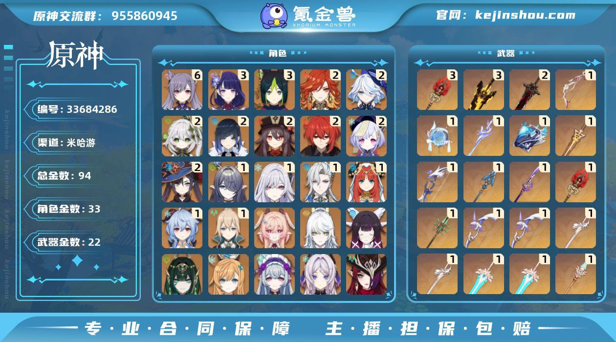 月卡刚开,300创世结晶,号上还有117粉球,3398原石,大概140抽左右。地图全满任务全清,没有肝图压力。开服玩家,活动武器齐全,资源多。3+1雷神,2+3胡桃,2+1夜兰,2+0火神水神草神,1+1丝柯克龙王妮露甘雨,1+0菈乌玛,0+1莉奈娅,爱可菲奶奶希诺宁等等,配对齐全,月结晶月绽放纳塔舰队。