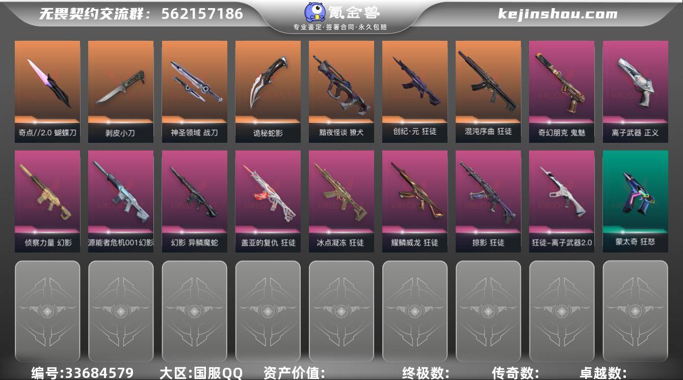 段位: 黄金 近战武器皮肤: 剥皮小刀-异形猎人,蝴蝶刀-奇点//2.0,神圣领域 战刀,诡秘蛇影 步枪皮肤: 狂徒-盖亚的复仇,幻影-侦察力量,狂徒-冰点凝冻,狂徒-耀鳞威龙,幻影-源能者危机001,狂徒-混沌序曲,獠犬-黯夜怪谈,狂徒-掠影,狂徒-创·纪元,幻影-异鳞魔蛇,狂徒-离子武器2.0 佩枪皮肤: 鬼魅-奇幻朋克,正义-离子武器,蒙太奇 狂怒