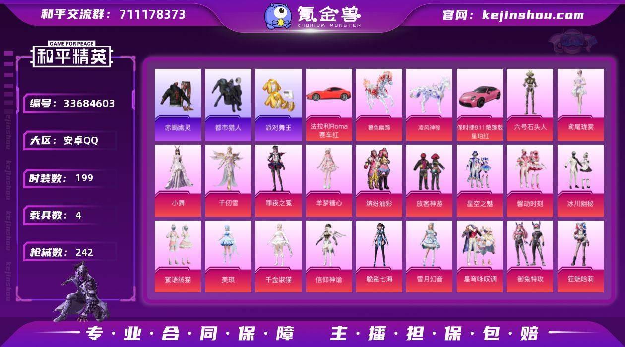 安卓 手Q-22粉装-15特效枪-4载具-9粉色飞行器-90083热力值-6王牌印记-199套装-242枪皮 【热门品类】:粉装-缤纷油彩,套装-浪漫天命,套装-赤蝎幽灵,套装-都市猎人,套装-派对舞王,套装-暗影哥特,套装-浪漫波比,套装-糯粉咩咩,套装-软软马卡龙,套装-红熊茄茄 【粉色套装】:粉装-缤纷油彩,粉装-放客神游,粉装-星空之魅,粉装-馨动时刻,粉装-冰川幽秘,粉装-蜜语绒猫,角色-美琪,角色-千金淑猫,角色-信仰神谕,角色-脆鲨七海,粉装-雪月幻音,粉装-星穹咏叹调,粉装-御兔特攻,角色-狂魅哈莉,角色-冷漠罗丽,角色-绯月迷踪,角色-羊梦糖心,角色-罪夜之冕,人物-小舞,角色-千仞雪,角色-鸢尾珑雾,角色-六号石头人 【粉色枪皮等级】:GROZA-镜光银凌(五级),AUG-罪夜之冕(四级),ARX-无垠阁(四级),UMP45-萌骑冒险(四级),AKS-74U-信仰神谕(七级),AKS-74U-星穹咏叹调(五级),P90-诸神·破晓(四级),Kar98K-巳巳如意(五级),Mk14-樱桃泡泡(四级),Mk14-福马献瑞(五级),MK12-雪月幻音(四级),SPAS-12-蜜语绒猫(一级),DP-28-豹影疾电(五级),MG-36-沧焰双生(五级),M338-回旋牧梦使(四级) 【粉色载具】:法拉利Roma(赛车红),保时捷911 敞篷版(星珀红),暮色幽...