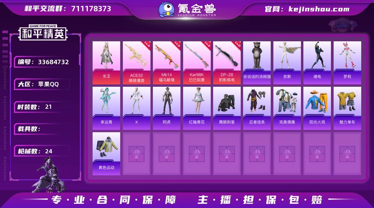 苹果 手Q-1粉装-4特效枪-0载具-0粉色飞行器-7193热力值-1王牌印记-21套装-24枪皮【热门品类】:套装-忍者信条【粉色套装】:角色-女王【粉色枪皮等级】:ACE32-萌骑漫游(三级),Kar98K-巳巳如意(三级),Mk14-福马献瑞(三级),DP-28-豹影疾电(二级)【粉色枪皮】:ACE32-萌骑漫游,Kar98K-巳巳如意,Mk14-福马献瑞,DP-28-豹影疾电【粉色降落伞】:闲梦青缨降落伞【稀有套装】:角色-奈斯,角色-魂电,角色-罗莉,角色-幸运青,角色-X,角色-阿虎,套装-雨过天青,套装-红釉青花,玩偶服-会说话的汤姆猫【稀有枪皮】:AKM-破晓战魂,SCAR-L-炫彩节奏,M416-红色方程式,AC-VAL-天降萌叽,UMP45-生命誓言,汤姆逊-像素花束,P90-巳巳如意,Mini14-金玉无双,MK20-H-绶带小兔【其他套装】:套装-完美偶像,套装-阳光火鸡,套装-魅力单车,套装-黄色运动,套装-鹰眼刺客【稀有头盔】:幻影战神头盔(2级),金羽特工头盔(1级)【稀有背包】:幻影战神背包(3级),幻影战神背包(2级),金羽特工背包(2级)【营地ID】:979662477