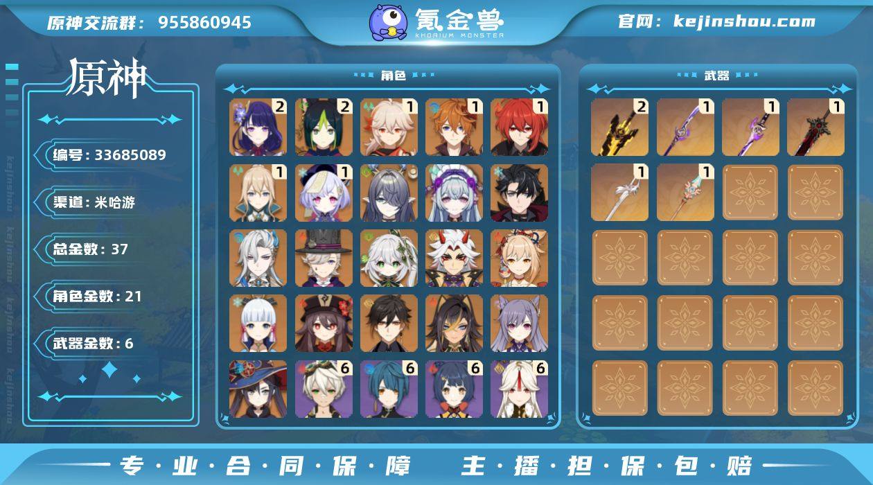 57级/37黄/女主/21个五星角色/6个五 星武器/一命枫原万叶/二命雷电将军/纳西妲/神里 绫华/钟离/一命达达利亚/胡桃/荒泷一斗/那维莱 特/宵宫/一命迪卢克/梦见月瑞希/一命琴/一命七 七/二命提纳里/莫娜/莱欧斯利/刻晴/菈乌玛/林尼/ 迪希雅/薙草之稻光/无工之剑/雾切之回光/天空之 脊/风鹰剑/狼的末路