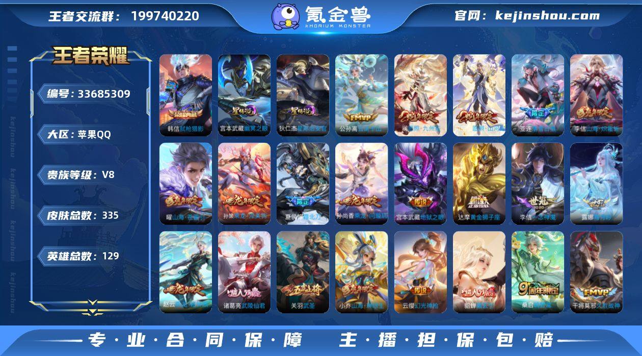 苹果Q-V8-最强王者段位-129英雄-335皮肤-1典藏皮肤-26传说-96史诗【英雄全皮】:司空震全皮,戈娅全皮,影全皮,海诺全皮【荣耀典藏】:韩信弑枪猎影【传说皮肤】:公孙离云诺千山,司空震愿照山河定,澜愿照九州拓,云缨幻光神枪,桑启鸣野蒿,夏侯惇霜北刀,亚连落雪白狼,貂蝉曦玄引,孙尚香乘龙问璇玑,孙策乘龙淬吴钩,赵云乘龙铭钟鼎,露娜霜月吟,小乔山海琳琅生,曜山海苍雷引,李信山海炽霜斩,吕布怒海麟威,铠绛天战甲,虞姬启明星使,关羽武圣,李信一念神魔,张良黄金白羊座,干将莫邪久胜战神,达摩黄金狮子座,后羿黄金射手座,诸葛亮武陵仙君,宫本武藏地狱之眼【限定皮肤】:夏侯惇霜北刀,暃埋骨钱,蒙犽顽岩魄,大乔绒语心约,姜子牙天穹之誓,狄仁杰阴阳师,小乔山海琳琅生,赵云皇家上将,墨子降魔,嬴政优雅恋人,孙尚香蔷薇恋人,庄周高山流水,高渐离玩趣恶龙,阿轲迷踪丽影,芈月重明,芈月白晶晶,典韦穷奇,马可波罗山海玄木吟,狄仁杰魔术师,狄仁杰万华元夜,达摩沙漠行僧,项羽海滩派对,老夫子醍醐杖,关羽武圣,程咬金演武夺筹,刘邦夺宝奇兵,韩信傲雪梅枪,兰陵王金庭之子,孙悟空至尊宝,李元芳匿光侦查者,李元芳云中旅人,虞姬启明星使...