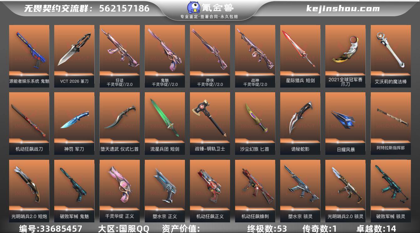 【套装】:2021全球冠军赛套装,VCT 2026 赛季套装,千灵华绽//2.0套装,塑水宗套装,千灵华绽套装,光明哨兵//2.0套装,破败军械套装,机动狂飙套装,堕天遗武套装,耀鳞威龙套装【英雄】:幻棱,炼狱,维斯,暮蝶,钛狐,壹决,铁臂,捷风,雷兹,幽影,不死鸟,贤者,猎枭,蝰蛇,零,芮娜,奇乐,尚勃勒,霓虹,斯凯,夜露,星礈,K/O,海神,盖可,黑梦,钢锁【近战武器】:近战武器-2021全球冠军赛 爪刀,近战武器-蒙太奇 战斧,近战武器-碎心裂刃,近战武器-VCT 2026 篆刀,近战武器-流风回雪,近战武器-嘟昂嘟昂超弹力水球拳套,近战武器-黑波之刃,近战武器-落英飞旋,近战武器-镭切,近战武器-艾沃莉的魔法棒,近战武器-威龙之刃,近战武器-流星兵团 短剑,近战武器-堕天遗武 仪式匕首,近战武器-钢轨卫士 战锤,近战武器-机动狂飙 战刀,近战武器-破败王者之残刃,近战武器-沙尘幻旅 匕首,近战武器-神罚 军刀,近战武器-圣石匕首,近战武器-诡秘蛇影 军刀,近战武器-日耀风暴 遗器,近战武器-阿特拉斯指挥部 甩棍,近战武器-星际猎兵 短剑【狂徒】:狂徒-2021全球冠军赛,狂徒-归零者,狂徒-洪荒怒焰,狂徒-机动狂飙,狂徒-塑水宗,狂徒-RGX 11z Pro,狂徒-千灵华...