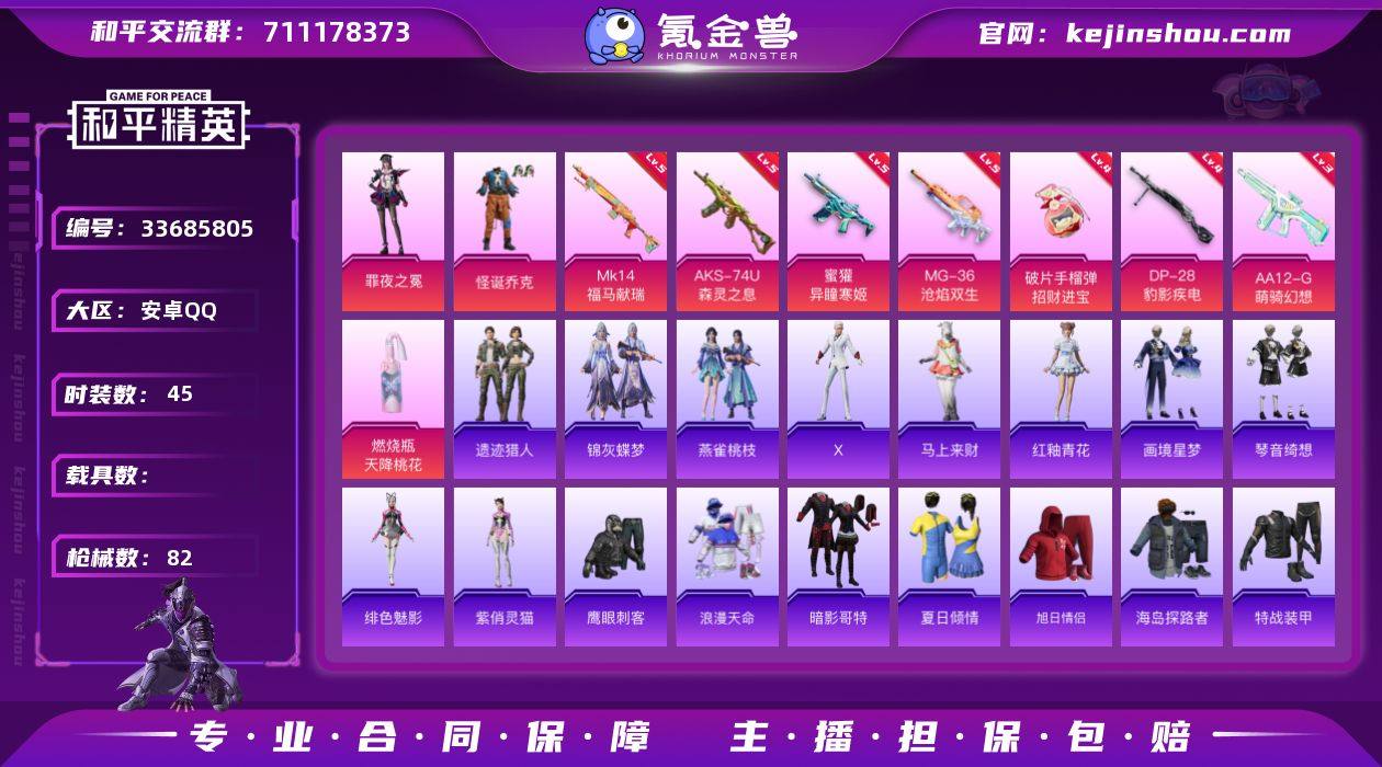 【A11887】安卓 【精品小号 粉装-怪诞乔克,套装-浪漫天命,套装-暗影哥特,KS-74U-森灵之息(五级),Mk14-福马献瑞(五级),手Q-2粉装-8特效枪-0载具-1粉色飞行器-22706热力值-2王牌印记-45套装-82枪皮 【热门品类】:粉装-怪诞乔克,套装-浪漫天命,套装-暗影哥特 【粉色套装】:粉装-怪诞乔克,角色-罪夜之冕 【粉色枪皮等级】:蜜獾-异瞳寒姬(五级),AKS-74U-森灵之息(五级),Mk14-福马献瑞(五级),AA12-G-萌骑幻想(三级),DP-28-豹影疾电(四级),MG-36-沧焰双生(五级),燃烧瓶-天降桃花(五级),破片手榴弹-招财进宝(四级) 【粉色枪皮】:蜜獾-异瞳寒姬,AKS-74U-森灵之息,Mk14-福马献瑞,AA12-G-萌骑幻想,DP-28-豹影疾电,MG-36-沧焰双生,燃烧瓶-天降桃花,破片手榴弹-招财进宝 【粉色飞行器】:炫彩糖果飞行器 【粉色降落伞】:喜羊羊与灰太狼降落伞,异瞳寒姬降落伞,炫彩糖果降落伞,鸢尾珑雾降落伞 【稀有套装】:套装-炫彩糖果,角色-X,套装-马上来财,套装-遗迹猎人,角色-绯色魅影,角色-紫俏灵猫,套装-画境星梦,套装-琴音绮想,套装-雨过天青,套装-红釉青花,套装-锦灰蝶梦,套装-燕雀桃枝 【稀有枪皮】:AUG-冰晶雪宝,AKM-影袭,AKM-星之彼岸,AKM-龙的...