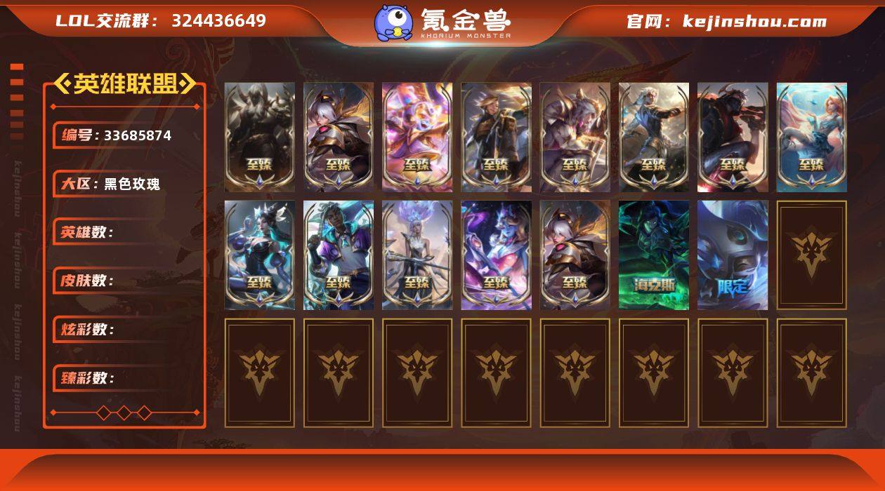 [18973093]3终极 20神话 30限定 37传说 34史诗 234皮肤 101炫彩 171英雄 可二次 可修改实名 【至臻】至臻 暗星女王 黛安娜,至臻 魔域梦魇 泽丽,至臻 K/DA 伊芙琳,至臻 腥红之月 亚托克斯,至臻 源计划:正义 艾瑞莉娅,至臻 索拉卡,至臻 太空律动 节奏幻师 璐璐,至臻 灵能特工 伊泽瑞尔,至臻 女帝 黛安娜,至臻 黑夜使者 凯隐,至臻 西部魔影 泰隆,至臻 海之歌 萨勒芬妮,至臻 星之守护者 艾克,至臻 星之守护者 辛德拉,至臻 海珀利安小队 迦娜,至臻 太空律动 魔音海妖 娜美,至臻 星之守护者 索拉卡,至臻 绝息圣堂 厄运小姐 【海克斯】摄魂 薇恩 【限定】玉剑传说 星仙子,双城之战2 微光实验室 辛吉德,创星之灵 璐璐 【情人节限定】觅心猫猫 悠米 【赛季限定皮】胜利之运 崔斯特,胜利剑圣 易,胜利女神 娑娜,胜利巨口 克格莫 【冠军限定系列】S2 暗杀星 蒙多,S2 暗杀星 慎,S4 SSW 泰隆,S4 SSW 炼金,S5 SKT T1 阿兹尔,S11 EDG 悠米 【冰雪节限定】冬季仙境 发条,寒冬精灵 璐璐,魄罗骑士 瑟庄妮,圣诞老人 古拉加斯,圣诞玩偶 波比,雪默丁格 【万圣节限定】魅惑女巫 崔丝塔娜,魅惑女巫 娜美,南瓜头 费德提克 【年限】定海神针 孙悟空 【周年】女帝 格温,12周年 劫,10周年 凤凰 【其他限...