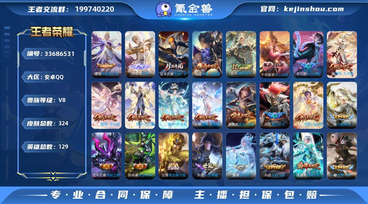 安卓Q-V8-最强王者段位-129英雄-324皮肤-1典藏皮肤-1无双-1珍品传说-35传说-107史诗 【英雄全皮】:孙权全皮,马超全皮,敖隐全皮,空空儿全皮,影全皮 【荣耀典藏】:虞姬神鉴启示录 【无双皮肤】:孙悟空无相 【珍品传说】:宫本武藏黑崎一护 【传说皮肤】:马超神骥逐星野,后羿神树通天,干将莫邪千山共赴,司马懿九山相柳,司空震愿照山河定,女娲愿照千秋盛,妲己愿照众生和,澜愿照九州拓,蔡文姬愿照福禄聚,虞姬愿照岁时盈,云缨幻光神枪,裴擒虎祥瑞亨通,桑启鸣野蒿,马超琥珀纪元,露娜霜月吟,上官婉儿妄想奇谈,马可波罗妄想实况,孙悟空齐天大圣,不知火舞绯月行,马超无双飞将,裴擒虎寅虎赤拳,赵云淬星耀世,诸葛亮时雨天司,镜炽阳神光,虞姬启明星使,曜云鹰飞将,李信一念神魔,干将莫邪久胜战神,虞姬云霓雀翎,达摩黄金狮子座,后羿黄金射手座,孙尚香末日机甲,宫本武藏地狱之眼,孙悟空地狱火,狄仁杰超时空战士 【限定皮肤】:蔡文姬夏日便利店,虞姬夏日便利店,姜子牙天穹之誓,李白谪仙醉月,狄仁杰阴阳师,赵云皇家上将,墨子降魔,孙尚香蔷薇恋人,庄周高山流水,钟无艳超时空战士,元歌无心,甄姬落雪兰心,典韦岱宗,马可波罗山海玄木吟,马...