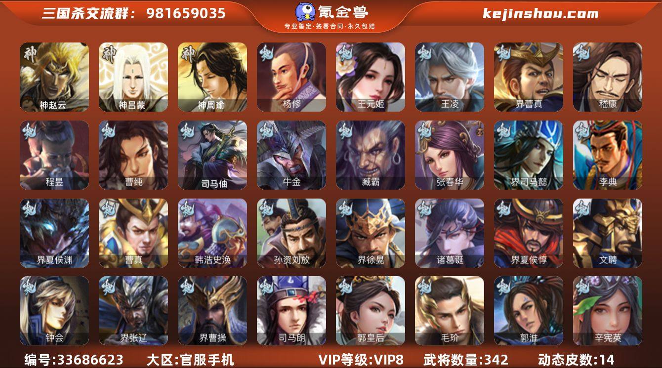 【14790306】官阶:骠骑将军;VIP等级:VIP8;史诗武将数量:27;动态皮肤数量:14;武将总数:342;史诗宝珠数量:0;将魂数量:541;神将:1;魏国史诗武将:10;蜀国史诗武将:7;吴国史诗武将:1;群史诗武将:11