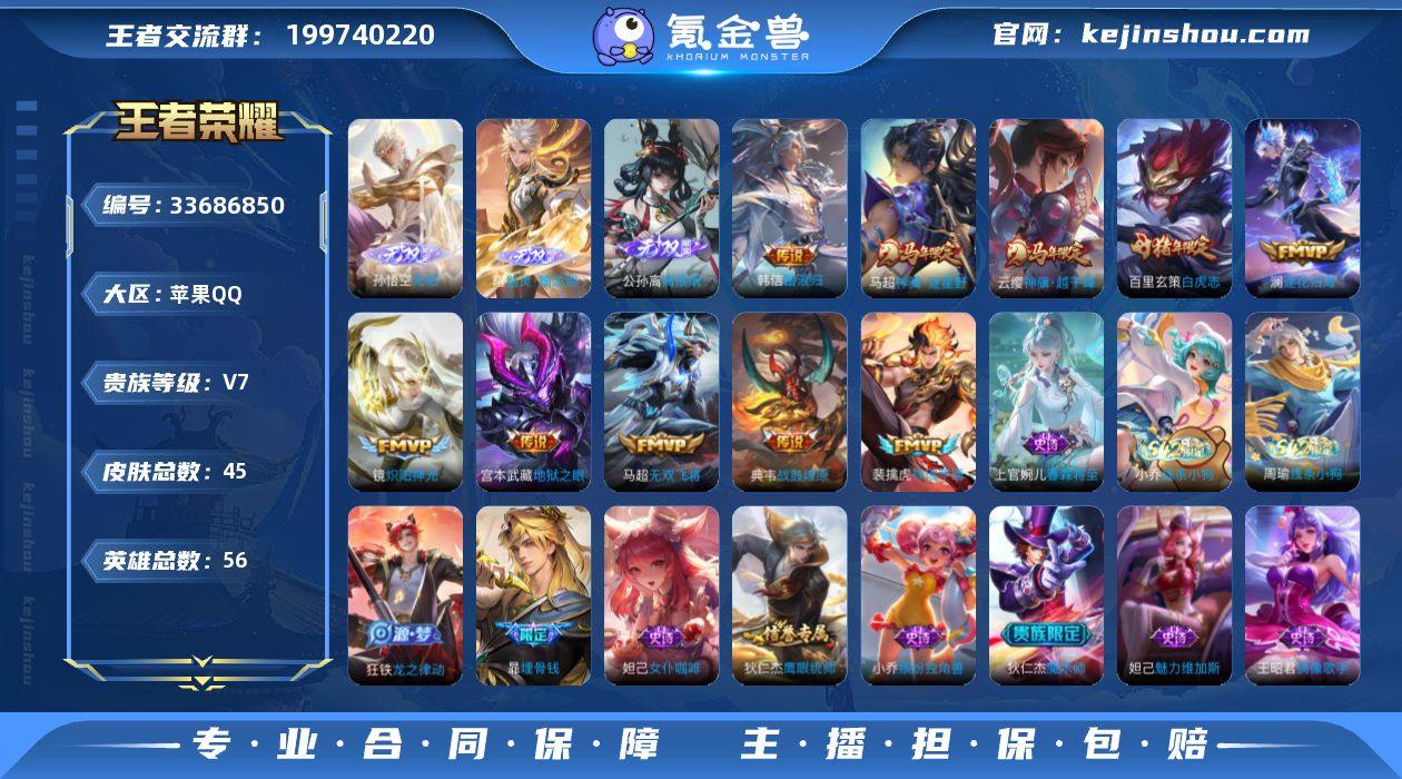 【高性价比·3无双·离恨烟·器灵螭龙剑·无相·白虎志·神骥越千峰·神骥逐星野·踏浪归·逐花归海·祥瑞亨通·可二次】YXw23404-苹果Q-56英雄-45皮肤-1王者印记-18铭文-贵族积分3w【贵族7】【3无双·10传说·15按键】【因赛季更新游戏段付以上号为准!】 【无双皮肤】:孙悟空无相,曜器灵螭龙剑,公孙离离恨烟 【传说皮肤】:韩信踏浪归,云缨神骥越千峰,马超神骥逐星野,裴擒虎祥瑞亨通,典韦战鼓燎原,澜逐花归海,马超无双飞将,镜炽阳神光,百里玄策白虎志,宫本武藏地狱之眼 【限定皮肤】:公孙离离恨烟,暃埋骨钱,狄仁杰阴阳师,赵云皇家上将,狄仁杰魔术师,项羽海滩派对,百里玄策白虎志 【年限皮肤】:百里玄策白虎志 【战令限定】:周瑜线条小狗,小乔线条小狗 【史诗皮肤】:上官婉儿春霖将至,周瑜线条小狗,小乔线条小狗,狂铁龙之律动,暃埋骨钱,镜玫瑰异探,狄仁杰鹰眼统帅,小乔缤纷独角兽,妲己女仆咖啡,妲己魅力维加斯,狄仁杰魔术师,王昭君偶像歌手,赵云皇家上将 【其他皮肤】:影百相守梦,大司命暗都幽影,王昭君幻想奇妙夜,狄仁杰阴阳师,后羿阿尔法小队,宫本武藏万象初新,亚瑟死亡骑士,安琪拉玩偶对对碰,赵云忍炎影,项羽海滩派对,镜冰刃幻境,马超幸...