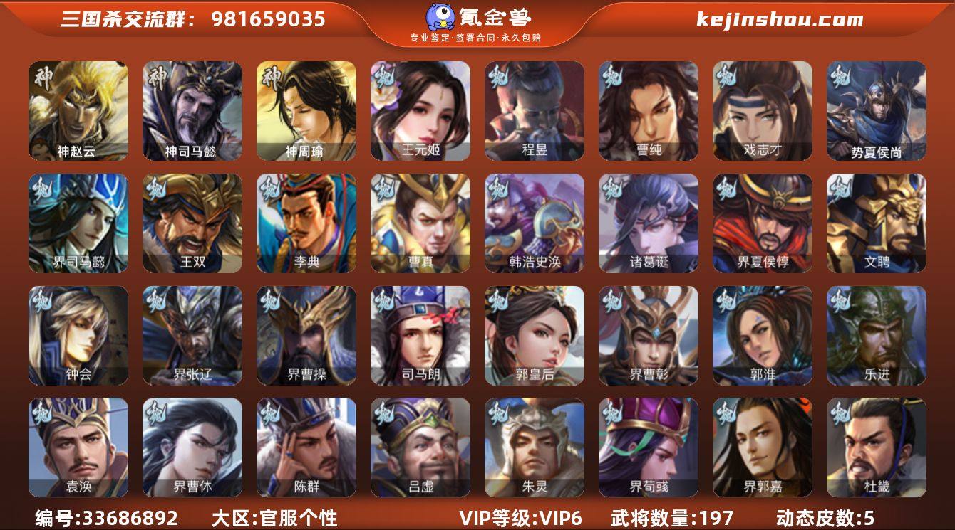 神赵云,神司马懿,王元姬,曹纯,戏志才,程昱,马云騄,谋马超,势魏延,周处,孙皓,界朱然,界徐盛,神周瑜,势夏侯尚,SP关羽,乐进,曹昂,诸葛诞,朱灵,文聘,SP姜维,钟会,曹冲,郭淮,满宠,界曹操,界司马懿,界夏侯惇,界张辽,界郭嘉,李典,曹真,韩浩史涣,陈群,曹叡,曹休,钟繇,司马朗,郭皇后,吕虔,界荀彧,杜畿,界曹彰,卞夫人,袁涣,王双,界曹休,SP孙尚香,关银屏,夏侯霸,马良,关兴张苞,廖化,界马岱,关平,刘封,界法正,界关兴张苞,界刘备,界赵云,SP徐庶,吴懿,周仓,张松,刘谌,夏侯氏,糜竺,严颜,界庞统,张翼,邓芝,傅肜,界张嶷,谋张飞,来敏,诸葛果,甘夫人,凌操,大乔小乔,诸葛瑾,孙鲁育,程普,韩当,潘璋马忠,虞翻,界甘宁,界吕蒙,界黄盖,界周瑜,界大乔,界陆逊,孙鲁班,朱桓,顾雍,朱治,孙登,界孙权,潘濬,吕岱,界潘璋马忠,陈武董袭,界顾雍,界孙鲁班,谋韩当,界孙休,界朱治,伏完,刘协,界袁术,SP赵云,SP貂蝉,张宝,伏皇后,李儒,华雄,袁术,界华佗,界吕布,公孙瓒,蔡夫人,公孙渊,张鲁,界貂蝉,界刘表,丁原,胡车儿,王...