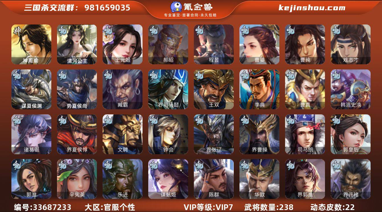 【14790303】官阶:骠骑将军;VIP等级:VIP7;史诗武将数量:18;动态皮肤数量:22;武将总数:238;史诗宝珠数量:0;将魂数量:2033;神将:0;魏国史诗武将:8;蜀国史诗武将:4;吴国史诗武将:3;群史诗武将:4