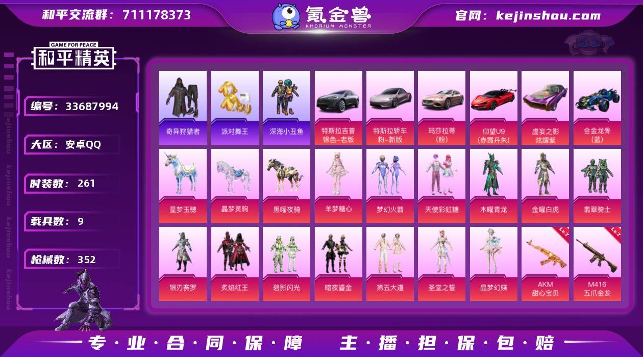 【kyhp1925】安卓 手Q-无敌战神框-13粉装-13特效枪-9载具-9粉色飞行器-130331热力值-25王牌印记-261套装-352枪皮 【热门品类】:粉装-梦幻火箭,绝对防御上衣,套装-浪漫天命,套装-派对舞王,套装-深海小丑鱼,套装-奇异狩猎者,套装-金羽特工,套装-SS1特训,套装-龟仙人,套装-暗影哥特,套装-浪漫波比,熔岩游骑兵连帽夹克 【粉色套装】:粉装-天使彩虹糖,粉装-木曜青龙,粉装-金曜白虎,粉装-梦幻火箭,粉装-翡翠骑士,粉装-银刃赛罗,粉装-炙焰红王,粉装-碧影闪光,粉装-暗夜鎏金,粉装-第五大道,角色-圣堂之誓,角色-晶梦幻蝶,角色-羊梦糖心 【粉色枪皮等级】:AKM-甜心宝贝(七级),AKM-炫紫旋律(四级),SCAR-L-梦幻火箭(五级),M416-五爪金龙(七级),M416-心之恋语(六级),AUG-暖羊咩咩(五级),M762-甜蜜誓约(七级),M762-激战未来(四级),AKS-74U-森灵之息(五级),Kar98K-巳巳如意(五级),Mk14-福马献瑞(五级),DP-28-豹影疾电(五级),MG3-洛神天依(七级) 【粉色载具】:特斯拉Model X(冷光银),特斯拉Roadster(沁心粉),玛莎拉蒂Ghibli(粉),仰望U9(赤霞丹朱),虚妄之影(炫耀紫),合金龙骨(蓝),星梦玉骢,晶梦灵驹,黑曜夜骑 【粉色枪皮】:AKM-甜...