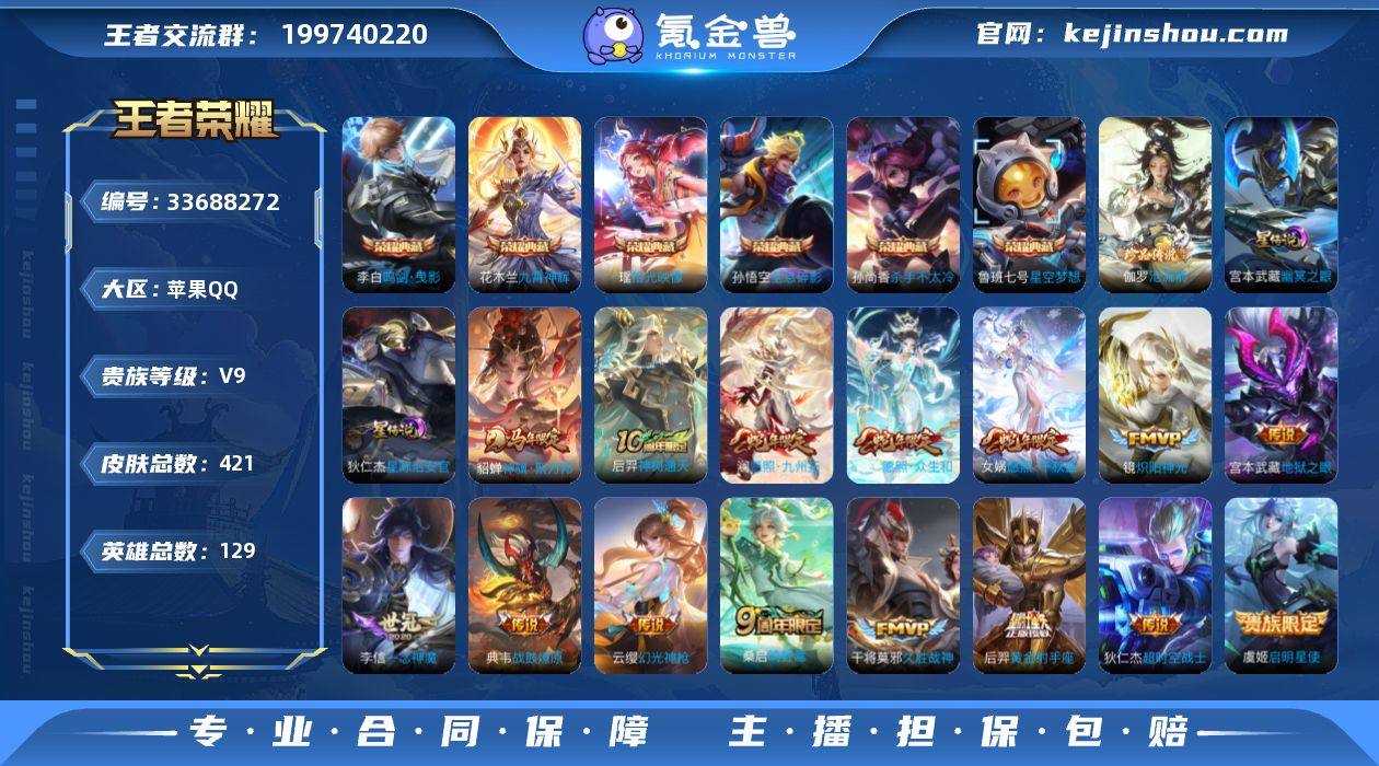 【精品推荐·全息碎影·杀手不太冷·星空梦想·鸣剑曳影·九霄神辉·拾光映像·沧流箭·神骥聚万邦·愿照千秋盛·愿照众生和·愿照九州拓·共赏芳华天幕·秋月华灯天幕·无二次包过】YXw24164-苹果Q-129英雄-421皮肤-17王者印记-300铭文-贵族积分11w【贵族9】【6典藏·1珍品·2星传说·18传说·2天幕·27按键·262幸运值】【因赛季更新游戏段付以上号为准!】 【英雄全皮】:刘禅全皮,扁鹊全皮,孙权全皮,苍全皮,狂铁全皮,敖隐全皮,蒙恬全皮,戈娅全皮,空空儿全皮 【荣耀典藏】:孙悟空全息碎影,孙尚香杀手不太冷,鲁班七号星空梦想,李白鸣剑曳影,花木兰九霄神辉,瑶拾光映像 【珍品传说】:伽罗沧流箭 【星元皮肤】:宫本武藏幽冥之眼,狄仁杰星际治安官 【天幕】:共赏芳华天幕,秋月华灯天幕 【传说皮肤】:貂蝉神骥聚万邦,后羿神树通天,女娲愿照千秋盛,妲己愿照众生和,澜愿照九州拓,云缨幻光神枪,桑启鸣野蒿,典韦战鼓燎原,李元芳飞鸢探春,铠绛天战甲,镜炽阳神光,虞姬启明星使,李信一念神魔,张良黄金白羊座,干将莫邪久胜战神,后羿黄金射手座,宫本武藏地狱之眼,狄仁杰超时空战士 【限定皮肤】:白起狰,杨戬破阵退雄兵,狄仁杰阴阳师,虞姬凯尔特女王,赵云皇家上将,...