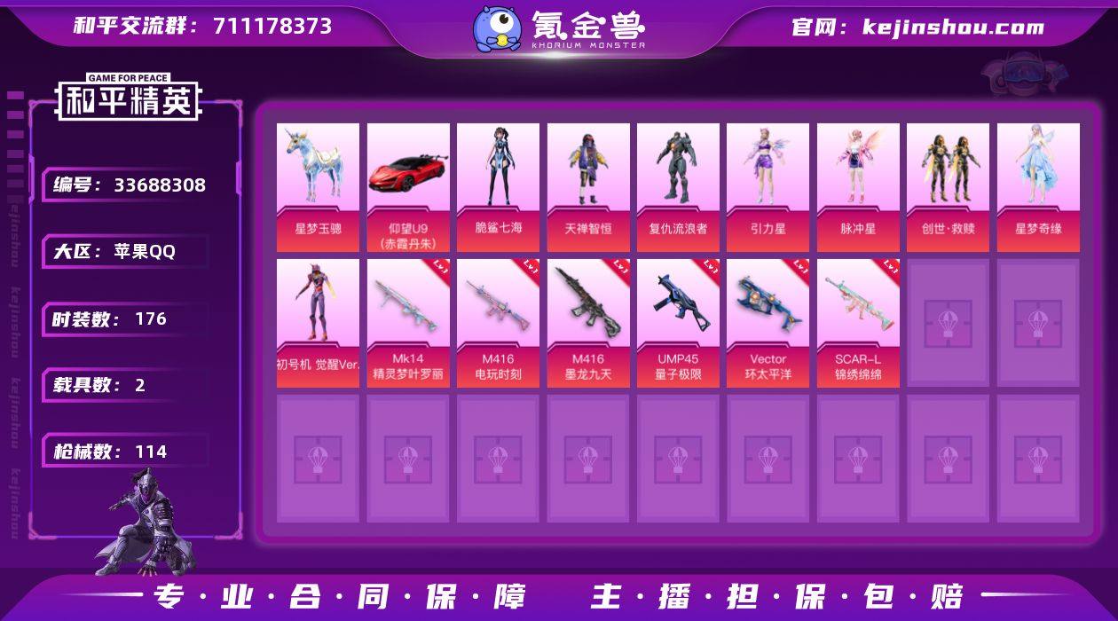 【稀有枪皮】镰刀-幽影之判,AUG-暖羊咩咩,蜜獾-荧海星豚,GROZA-镜光银凌,M416电玩时刻,Mk14精灵梦叶罗丽,M416墨龙九天,UMP45量子极限,Kar98K-巳巳如意,DP-28-豹影疾电,Vector环太平洋,SCAR-L-锦绣绵绵