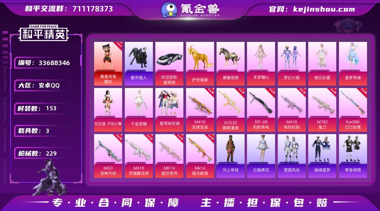 安卓 手Q-1神装-8粉装-10特效枪-3载具-9粉色飞行器-76426热力值-6王牌印记-153套装-229枪皮 【红色神装等级】:魔童闹海-哪吒(一级) 【红色角色神装】:魔童闹海-哪吒 【热门品类】:粉装-梦幻火箭,套装-都市猎人,套装-忍者信条,套装-龟仙人,套装-暗影哥特,角色-Mark.06 【粉色套装】:粉装-梦幻火箭,角色-烟云彩露,角色-星梦奇缘,角色-狂花道·不知火舞,角色-千金淑猫,粉装-星穹咏叹调,角色-羊梦糖心 【粉色枪皮等级】:M416-至情至圣(八级),M416-电玩时刻(五级),M416-灵猫魔法师(三级),M762-鬼刀(五级),ACE32-萌骑漫游(五级),Kar98K-巳巳如意(五级),Mk14-盛世惊鸿(三级),Mk14-福马献瑞(二级),DP-28-豹影疾电(五级),MG3-洛神天依(五级) 【粉色载具】:时空跃影(星辉银),护世瑞兽,黑曜夜骑 【粉色枪皮】:M416-至情至圣,M416-电玩时刻,M416-灵猫魔法师,M762-鬼刀,ACE32-萌骑漫游,Kar98K-巳巳如意,Mk14-盛世惊鸿,Mk14-福马献瑞,DP-28-豹影疾电,MG3-洛神天依 【粉色飞行器】:酣梦熊熊飞行器,炫彩糖果飞行器,祥瑞起舞飞行器,镜域双华-灵镜之阶,初号机 觉醒Ver.飞行器,曦光华影飞行器,凤舞九天飞行器,幻星舰长飞行器,灵猫魔法师飞行器...