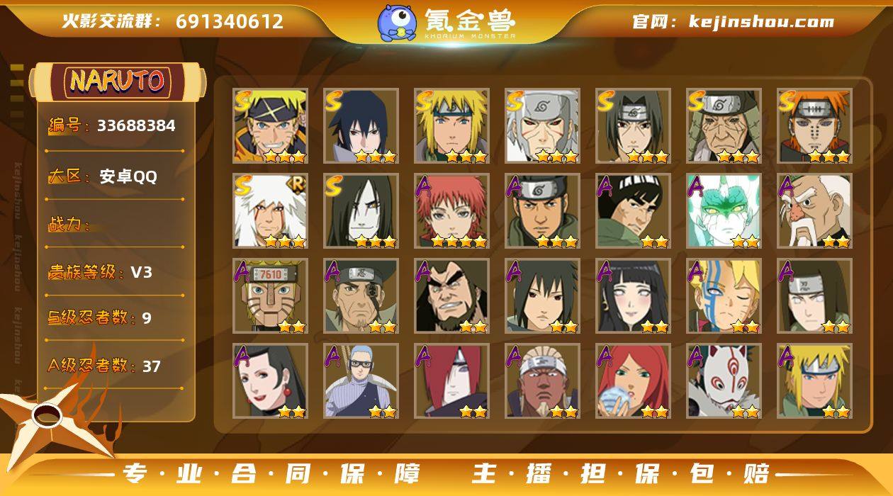 VIP等级V3/S忍数量9/A忍数量37/二星A-日向宁次·忍界大战/二星A-大野木「侠隐江湖」/二星A-我爱罗「疾风传」/二星A-飞段「死司凭血」/三星S-宇智波佐助「永恒万花筒」/二星A-长门「青年」/二星A-迈特凯/2星小南「神驹佑将」/三星S-猿飞日斩「秽土转生」/三星S-佩恩「天道」/三星S-漩涡鸣人·宇智波佐助/四星A-蝎/三星S-波风水门/二星A-秋道丁次「忍界大战」/二星A-猿飞阿斯玛「秽土转生」/二星A-漩涡博人「桃式显现」/二星A-旗木卡卡西「万花筒写轮眼」/三星S-千手扉间「秽土转生」/二星A-土台「忍界大战」/二星A-神秘面具男 「忍者之路」/2星旗木卡卡西「神威对决」/二星A-长十郎「六代目水影」/二星A-波风水门 「青年」/三星S-自来也「舞之豪杰」/二星A-药师兜「半蛇斗篷」/二星A-日向雏田 「最终章」/二星A-奇拉比/二星A-飞段/二星A-神农 「羁绊」/二星A-不风/二星A-宇智波佐助「万花筒写轮眼」/二星A-宇智波泉奈/二星A-迪达拉/二星A-巳月「仙人模式」/二星A-干柿鬼鲛/三星S-大蛇丸/二星A-艾 「青年」/二星A-漩涡鸣人「九尾查克拉」/三星A-猿飞阿斯玛/二星A-不缘/二星A-迈特凯「青春爆炸」/二星A-宇智波佐助「须佐能乎」/二星A-机械鸣人「初始形态」/二星A-千代「近松十人卫...