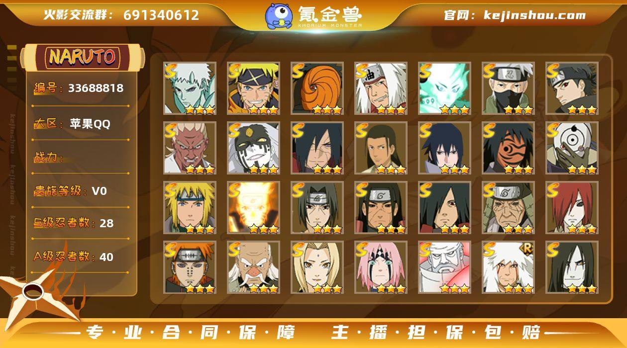 【编号70438 可秒换绑】【店长推荐!极品手法号!十尾带土+忍战艾+再不斩+漂泊带土!!】 28S级忍者数-40A级忍者数 【S级忍者】:长门「秽土转生」(3星),猿飞日斩「秽土转生」(3星),千手柱间「秽土转生」(3星),宇智波斑「秽土转生·解」(3星),大野木「忍界大战」(3星),春野樱「忍界大战」(3星),艾「忍界大战」(3星),宇智波鼬「须佐能乎」(3星),宇智波止水「须佐能乎」(3星),旗木卡卡西「须佐能乎」(3星),千手柱间「木叶创立」(3星),自来也「舞之豪杰」(3星),大蛇丸(3星),自来也「传说中的三忍」(3星),纲手(3星),宇智波斑(3星),波风水门(3星),神秘面具男「红夜之刃」(3星),漩涡鸣人「九喇嘛连结」(3星),佩恩「天道」(3星),宇智波佐助「永恒万花筒」(3星),宇智波斑 「白面具」(3星宇智波斑「白面具」),大筒木金式(3星),大筒木桃式(3星),大筒木舍人「最终章」(3星),宇智波斑「五影会谈」(3星),漩涡鸣人·宇智波佐助(3星),宇智波带土「十尾人柱力」(3星) 【A级忍者】:艾「青年」(2星),长门「青年」(2星),迪达拉(2星),奇拉比(2星),飞段(3星),飞段「死司凭血」(2星),飞段「恶灵之影」(2星),干柿鬼鲛(5星),漩涡博人「桃式显现」(2星),机械鸣人「...