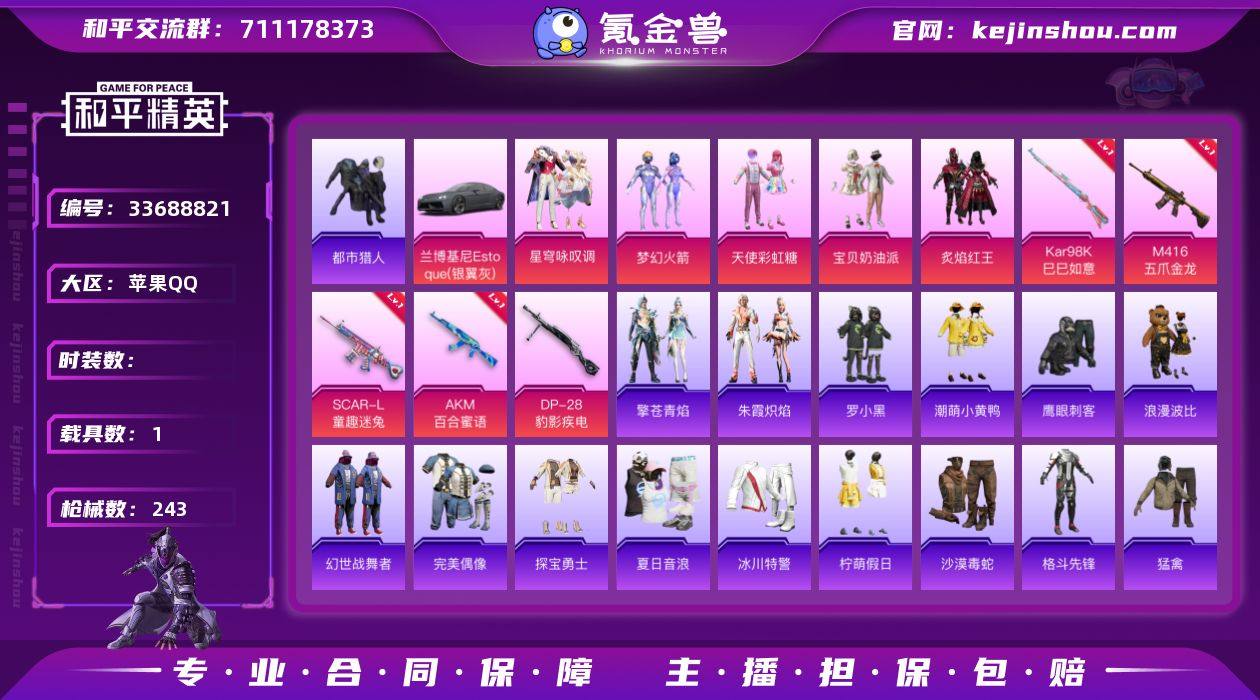 【N2304】161套装/枪械6/装备254/载具1/战备149/王牌印记16/热力值72467/七级AKM-百合蜜语/七级SCAR-L-童趣迷兔/七级M416-五爪金龙/五级Kar98K-巳巳如意/五级Mk14-福马献瑞/五级DP-28-豹影疾电/梦幻火箭/浪漫天命/都市猎人/潮萌小黄鸭/暗影哥特/浪漫波比/粉红小猪/8号机/Mark.06/宝贝奶油派/天使彩虹糖/炙焰红王/星穹咏叹调/兰博基尼Estoque(银翼灰)/AKM-百合蜜语/SCAR-L-童趣迷兔/M416-五爪金龙/Kar98K-巳巳如意/Mk14-福马献瑞/DP-28-豹影疾电/炫彩糖果飞行器/伏魔团飞行器/绝对恒星降落伞/甜心宝贝降落伞/梦幻火箭降落伞/炫紫旋律降落伞/童趣迷兔降落伞/守护天翼降落伞/初号机 觉醒Ver.降落伞/异瞳寒姬降落伞/炫彩糖果降落伞/角色-甜心蒙太奇/套装-雪国风尚/套装-马上来财/套装-遗迹猎人/朱霞炽焰/套装-凌霄紫焰/擎苍青焰/套装-书海巡游/套装-画境星梦/套装-琴音绮想/套装-雨过天青/套装-红釉青花/角色-枫露凝珀/套装-锦灰蝶梦/套装-燕雀桃枝/AUG-冰晶雪宝/AKM-夜灯/AKM-彩虹符号/AKM-影袭/AKM-星之彼岸/AKM-破晓战魂/AKM-萌趣颜团子/AKM-虎虎生威/AKM-霓虹街区/M16A4-幻世战舞者/M16A4-甜心亚梦/SCAR-L-炫彩节奏/SCAR-L-玉兔迎春/SCAR-L-黄金龙骨/M416-夜灯/M416-糯团青竹/...