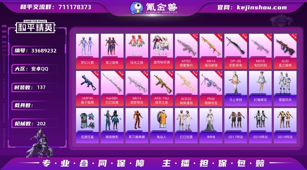 安卓 手Q-4粉装-11特效枪-0载具-5粉色飞行器-61944热力值-15王牌印记-137套装-202枪皮 【热门品类】:粉装-梦幻火箭,角色-军刀雅典娜,套装-龟仙人 【粉色套装】:粉装-梦幻火箭,粉装-星之彼岸,粉装-炫光之旅,粉装-星穹咏叹调 【粉色枪皮等级】:M416-电玩时刻(五级),AUG-星之彼岸(五级),M762-甜蜜誓约(七级),ACE32-萌骑漫游(三级),UMP45-量子极限(五级),AKS-74U-森灵之息(四级),Kar98K-巳巳如意(五级),Mk14-甜梦熊击(五级),Mk14-福马献瑞(五级),DP-28-豹影疾电(五级),PKM-萌骑夺宝(二级) 【粉色枪皮】:M416-电玩时刻,AUG-星之彼岸,M762-甜蜜誓约,ACE32-萌骑漫游,UMP45-量子极限,AKS-74U-森灵之息,Kar98K-巳巳如意,Mk14-甜梦熊击,Mk14-福马献瑞,DP-28-豹影疾电,PKM-萌骑夺宝 【粉色飞行器】:炫彩糖果飞行器,梦幻火箭飞行器,甜蜜誓约飞行器,星之彼岸飞行器,极意拳锋飞行器 【粉色降落伞】:快乐主宰降落伞,梦幻火箭降落伞,甜蜜誓约降落伞,星之彼岸降落伞,暗夜玫瑰降落伞,洛神天依降落伞,环太平洋降落伞,暖熊萌萌降落伞,仲夏莫吉托降落伞,天星战神降落伞,繁龙极客降落伞,荧海星豚降落伞,绯穹魔姬降落伞,异瞳寒姬降落伞,炫彩糖果降...